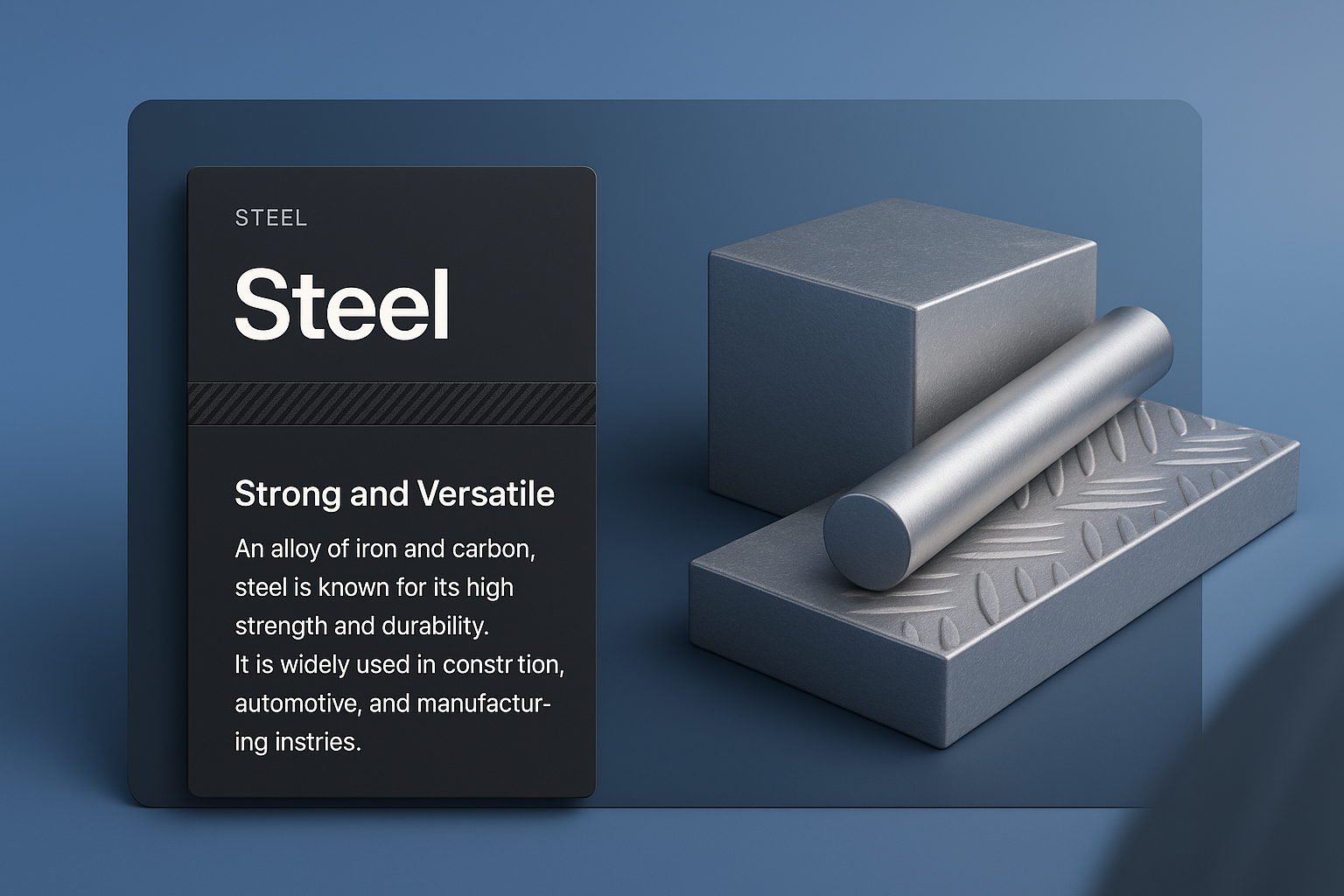 A striking 3D illustration of steel elements, including a steel bar and block, integrated with dark informational panels. The design emphasizes realism and depth with a smooth gradient background.