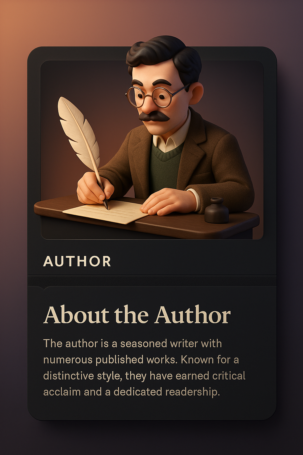 /Collection: /by davooda/Type: PNG/A captivating 3D illustration of an author writing at a desk, featuring a quill and inkpot. The design includes a dark panel with text about the author, set against a smooth gradient background.