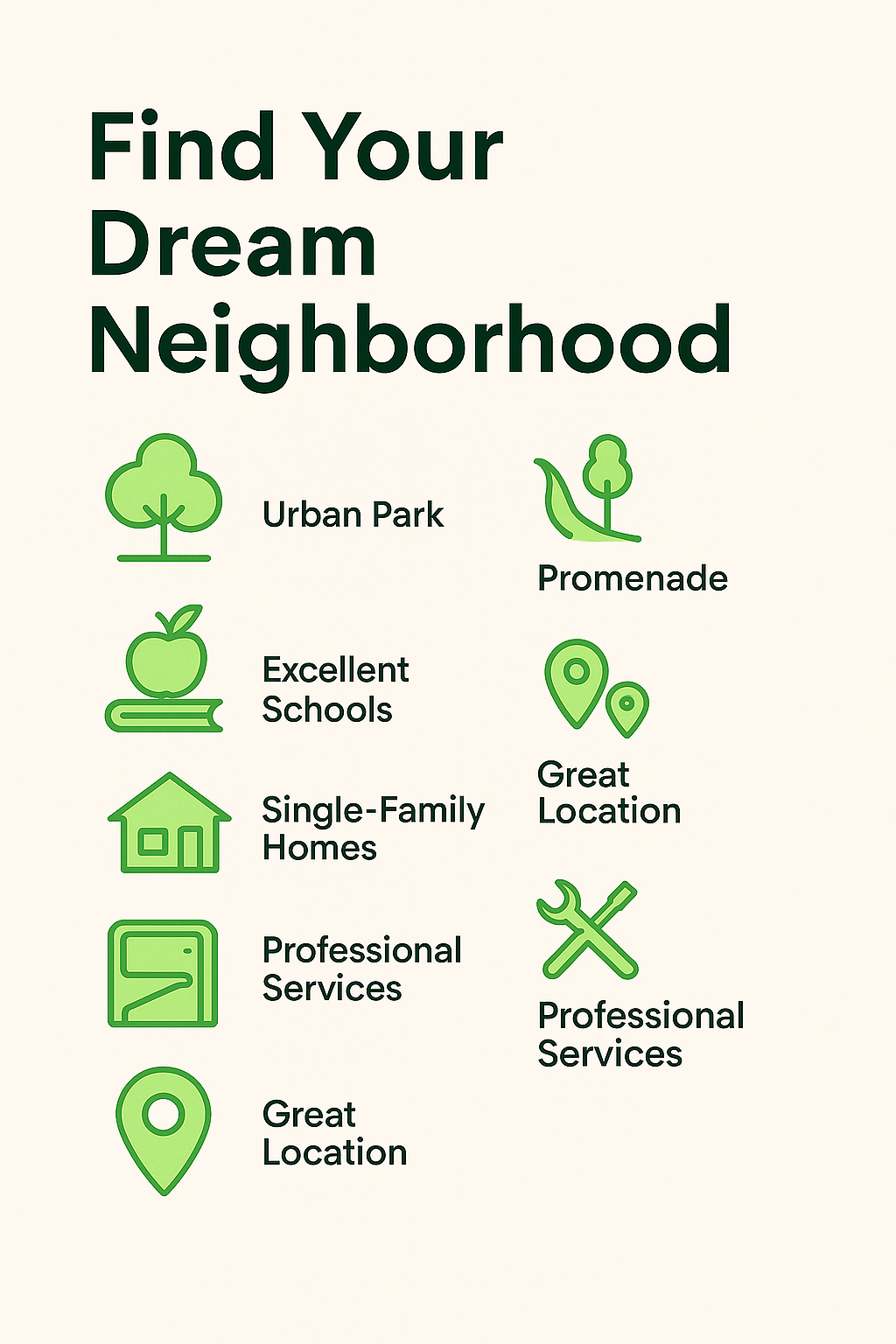 Informative infographic highlighting key features of an ideal neighborhood using simple line icons and clear typography, aimed at potential homebuyers and renters.