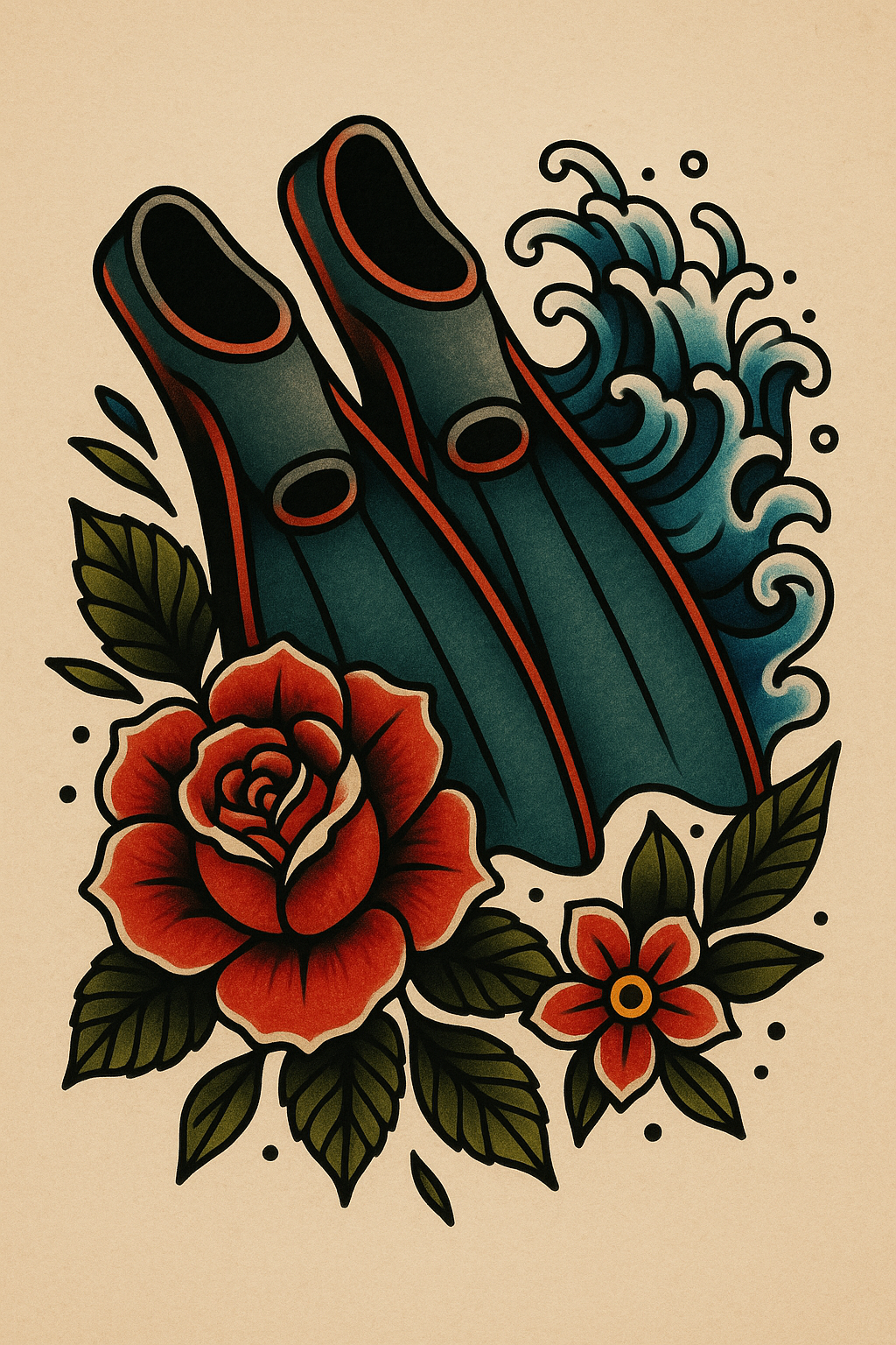 /Collection: /by davooda/Type: PNG/A colorful illustration featuring flippers surrounded by flowers and waves, combining elements of nature and aquatic themes. Suitable for art prints or merchandise.