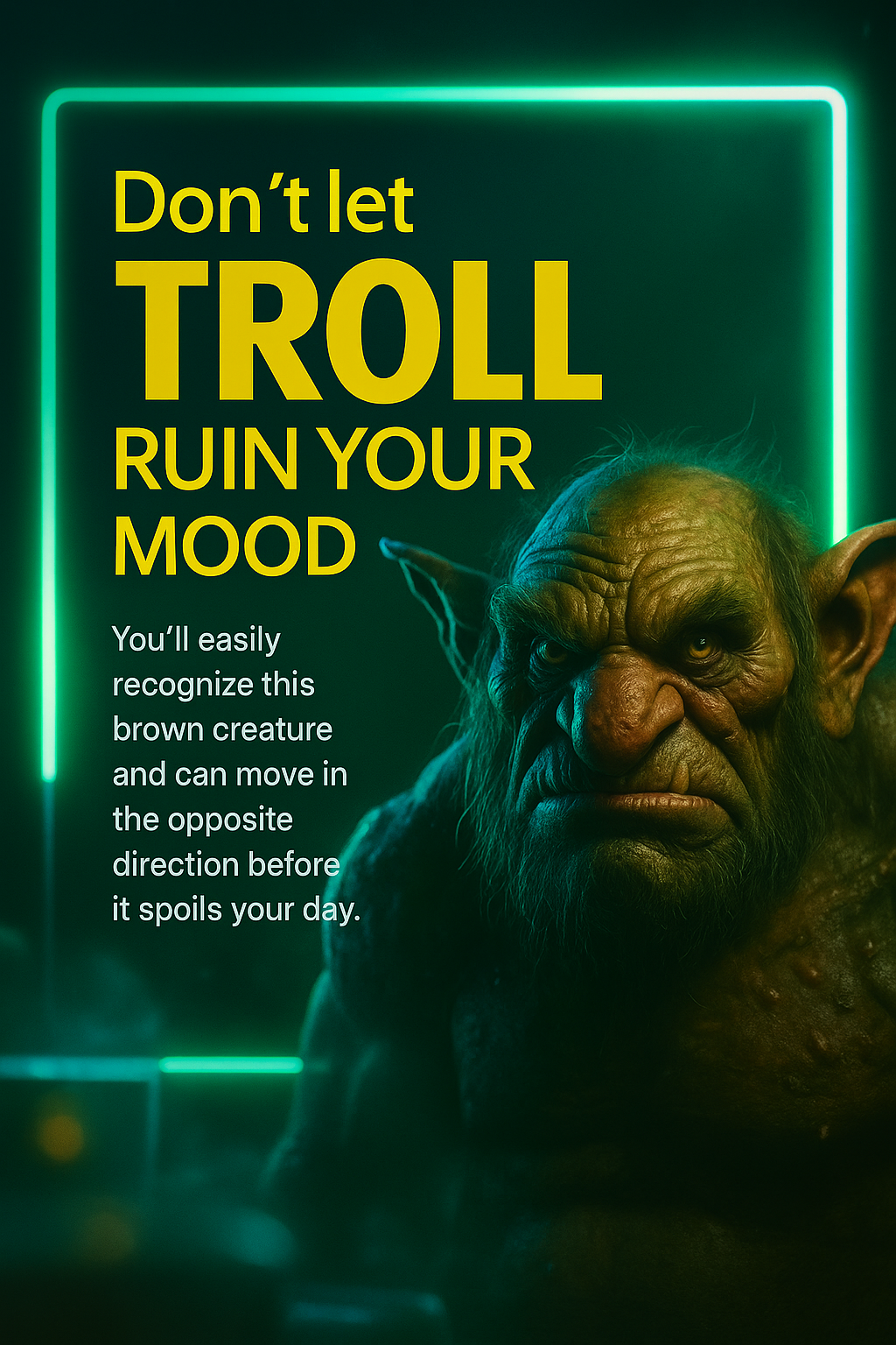 A realistic carousel slide design showcasing a troll character, with layered composition, vibrant neon accents, and engaging text elements highlighting the theme.