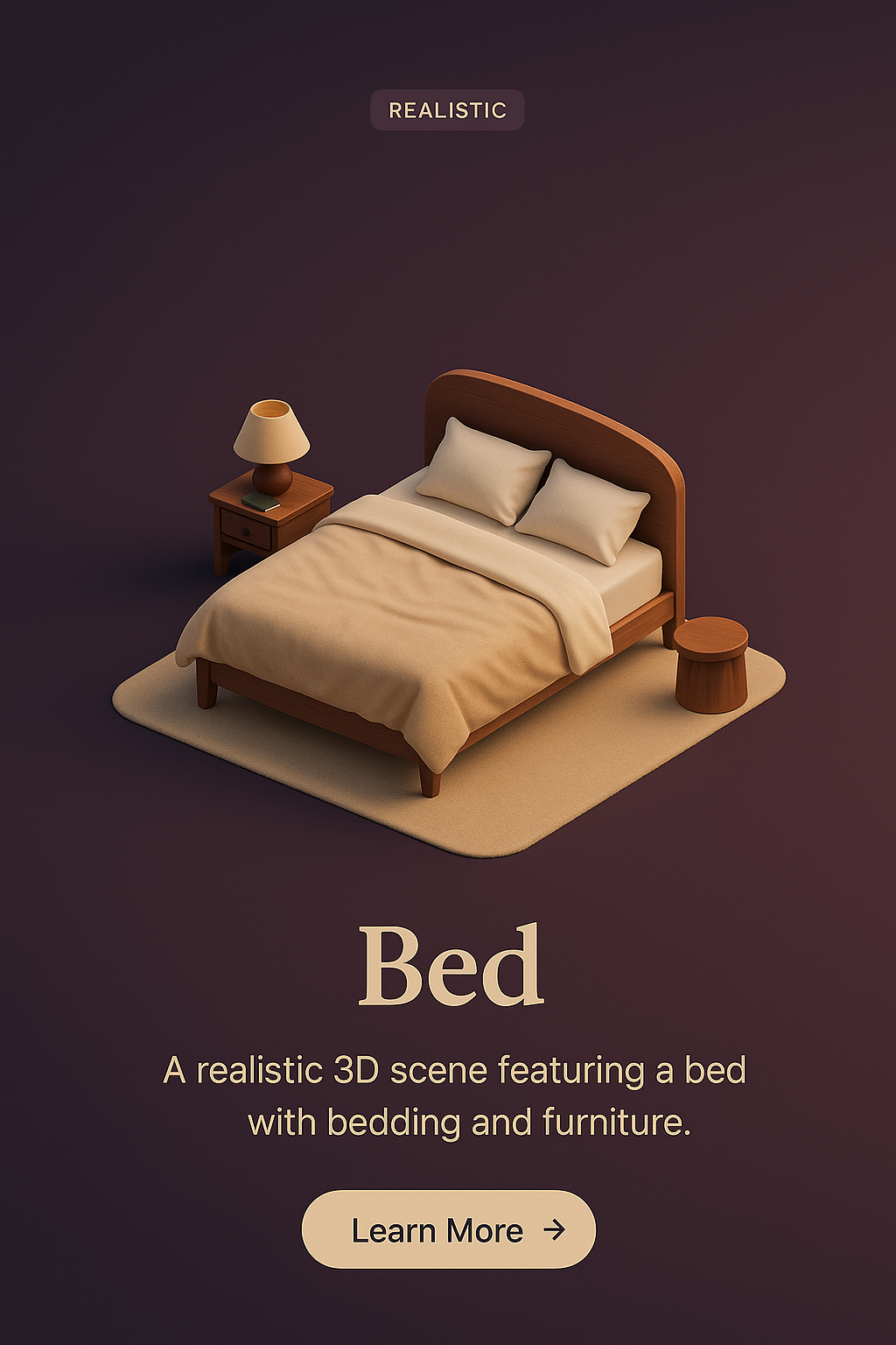A detailed 3D scene showcasing a cozy bed with stylish bedding and accompanying furniture, set against a dark gradient background, emphasizing realism.