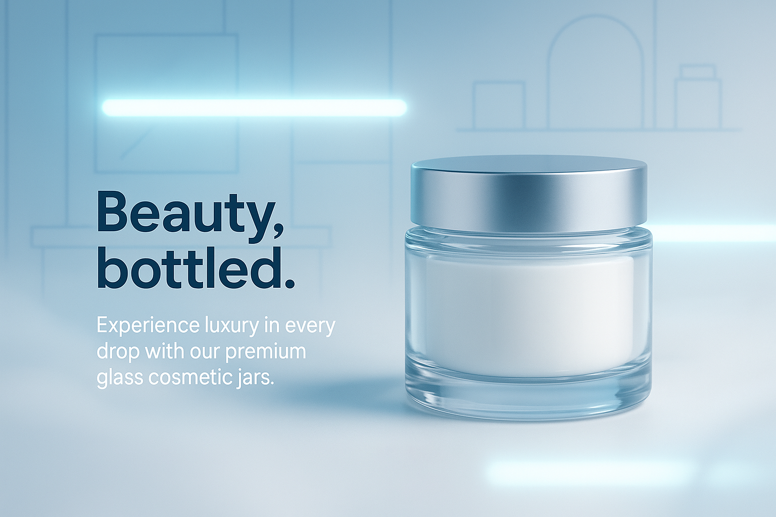 Sleek product showcase featuring a glass cosmetic jar with a modern design, ideal for beauty and skincare marketing. The image conveys luxury and quality.