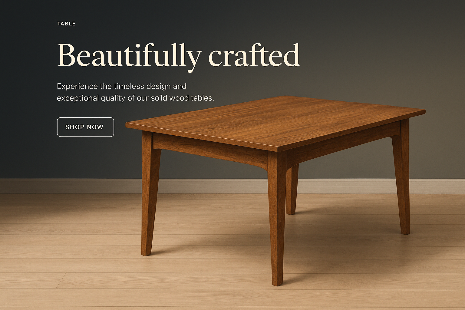 A beautifully crafted wooden table showcased against a gradient background. The design emphasizes elegance, featuring a simple yet sophisticated layout with a call-to-action button.