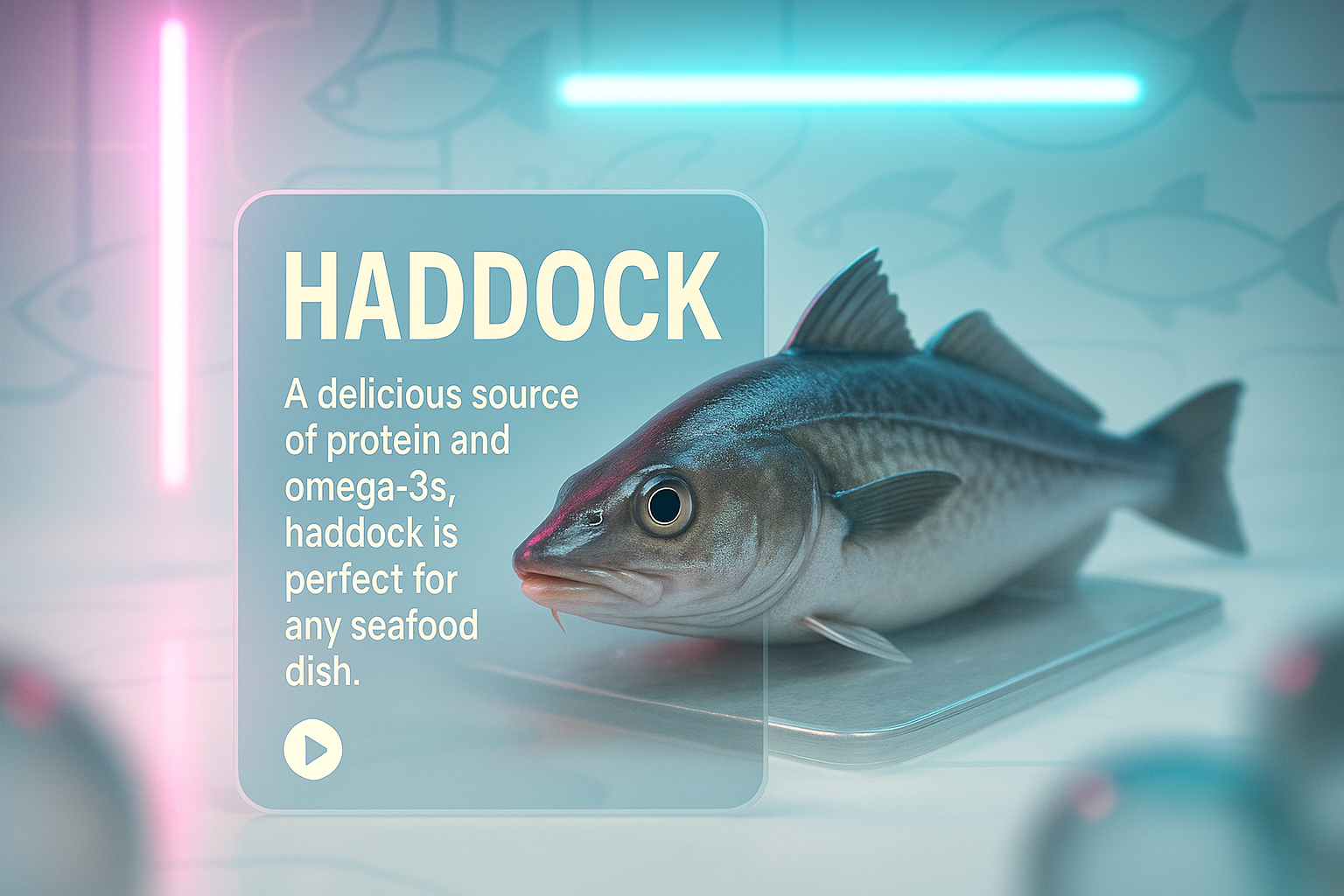 A visually appealing 3D render of a haddock fish, highlighted with neon accents and informative text, ideal for seafood marketing or culinary presentations.