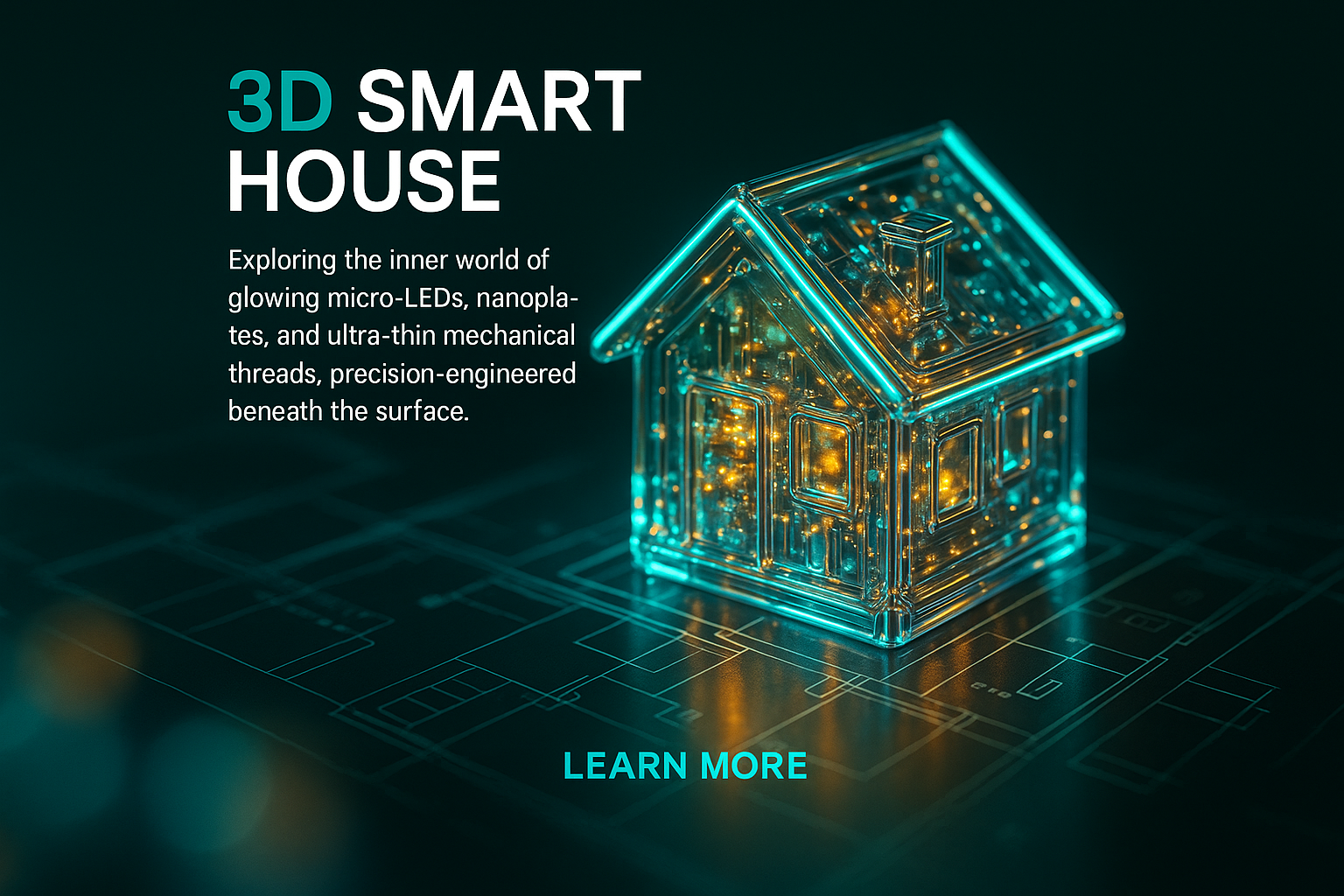 /Collection: /by davooda/Type: PNG/A hyper-realistic 3D model of a futuristic smart house, featuring transparent surfaces and glowing micro-LEDs, set against an architectural floorplan background.