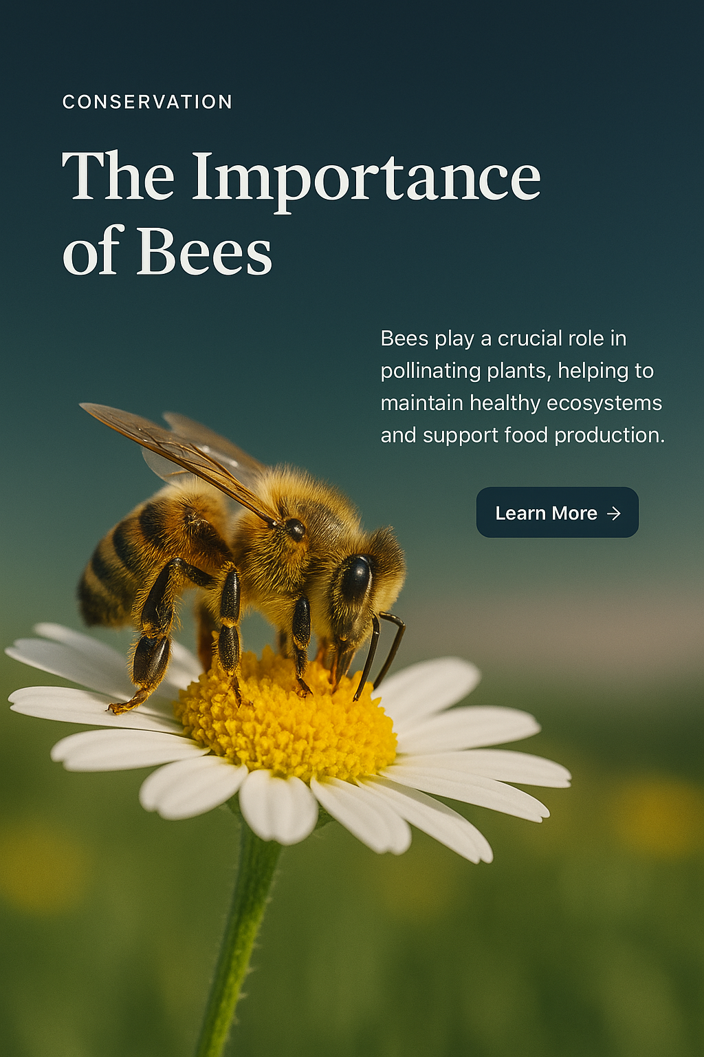 A visually appealing web page design focusing on the importance of bees in conservation. Features a bee on a flower, engaging text, and a call-to-action button.