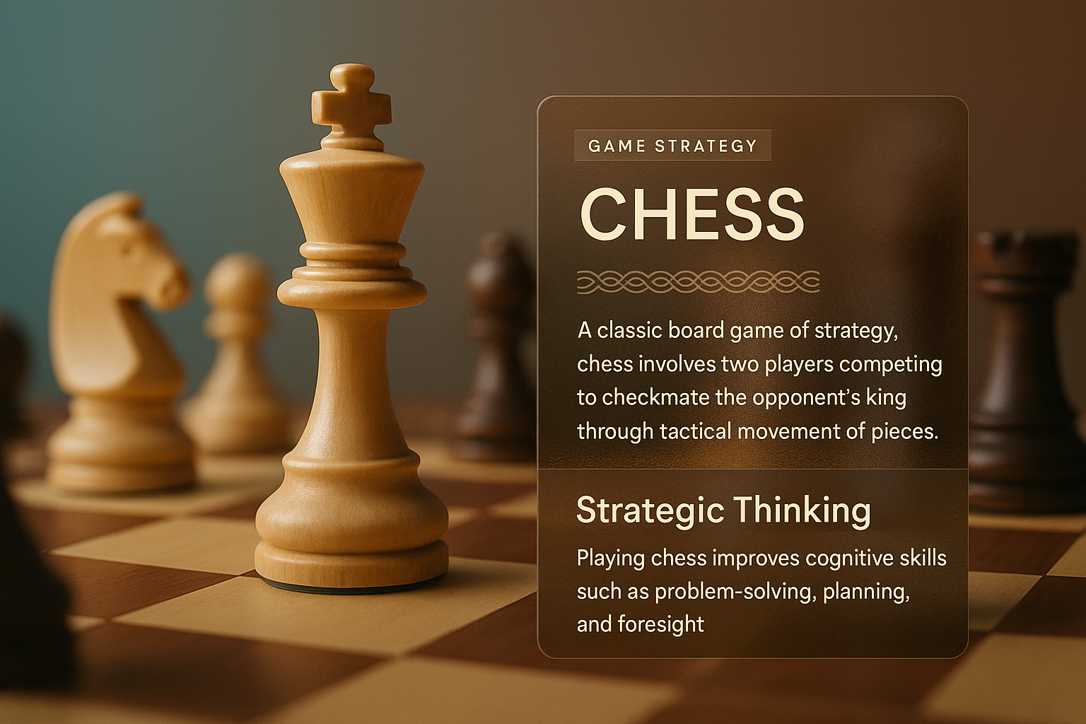 A visually engaging 3D illustration depicting a chess game with a wooden chess piece in focus. An informative overlay highlights game strategy and cognitive benefits.