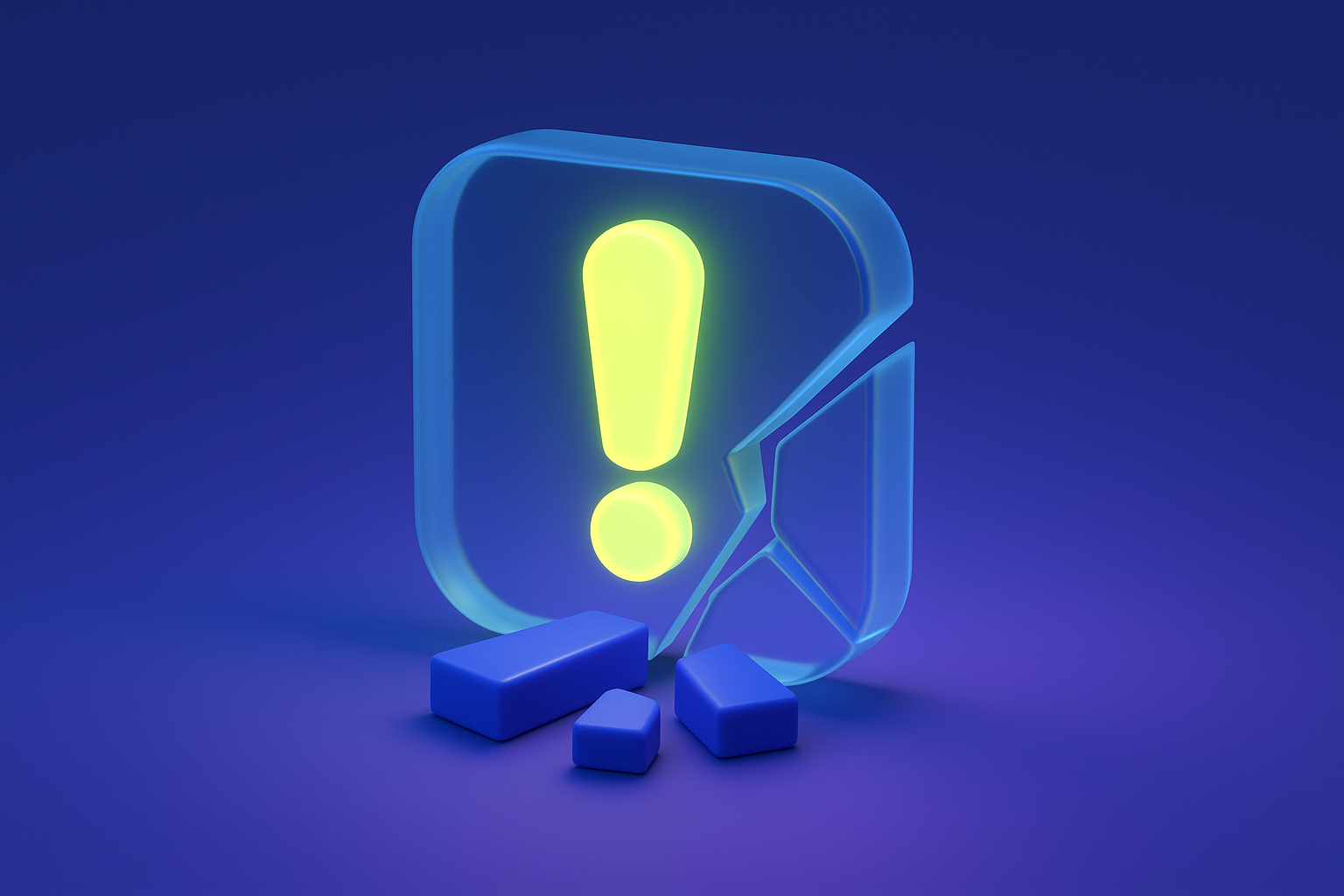 /Collection: /by davooda/Type: PNG/A stylized 3D icon featuring a glowing exclamation mark, partially cracked, with a soft light emanating through transparent glass elements. The scene is illuminated by cool blue and violet shades.