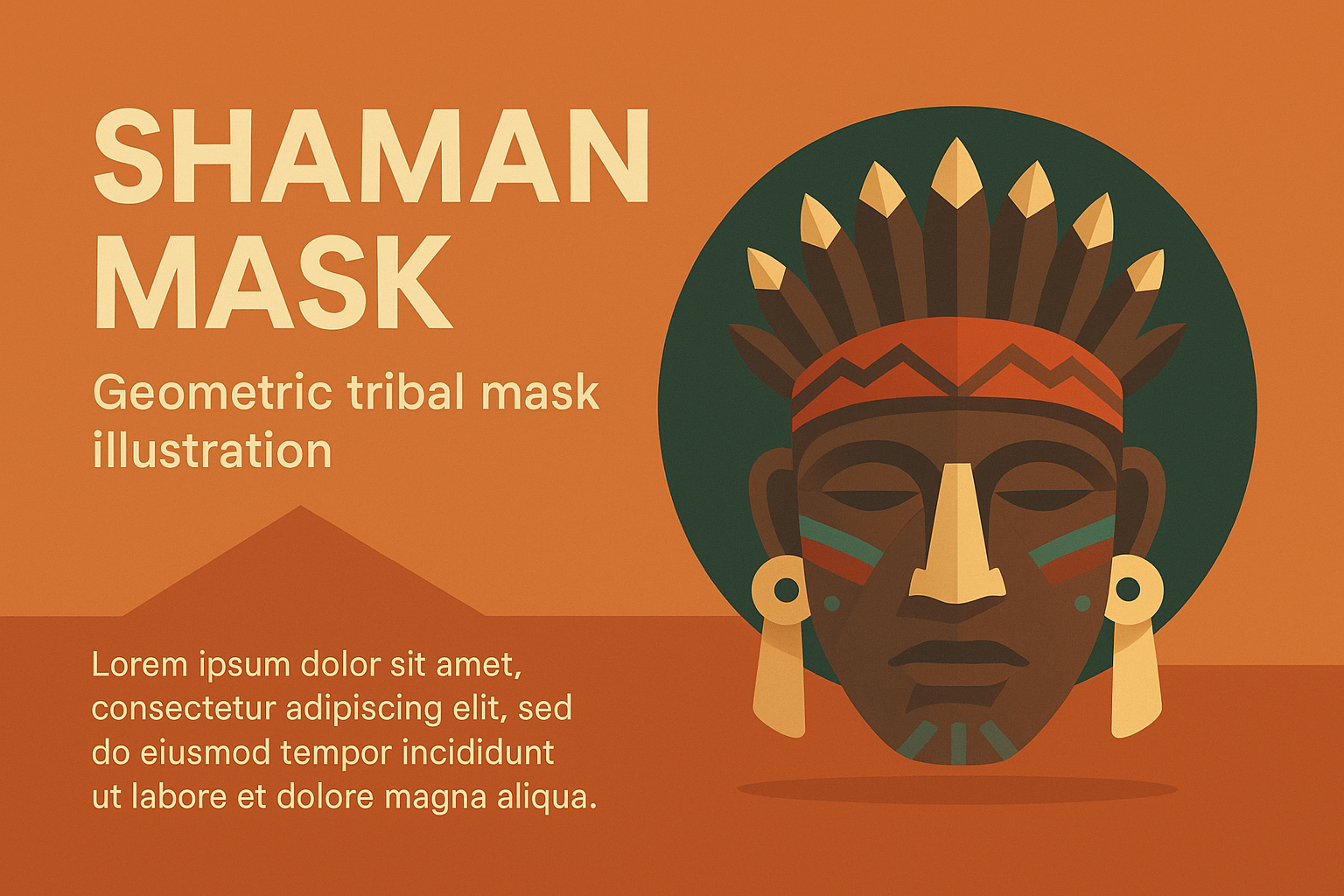 /Collection: /by davooda/Type: PNG/An illustrated shaman mask featuring geometric shapes and vibrant colors. The design includes a layered composition with a gradient background and engaging typography.