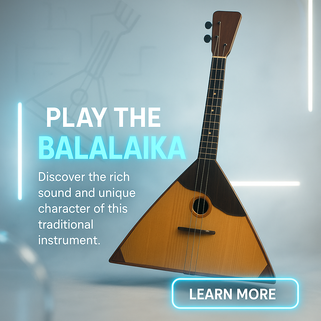 Modern promotional graphic featuring a balalaika, highlighting its unique sound and character. Ideal for music-related marketing or educational purposes.