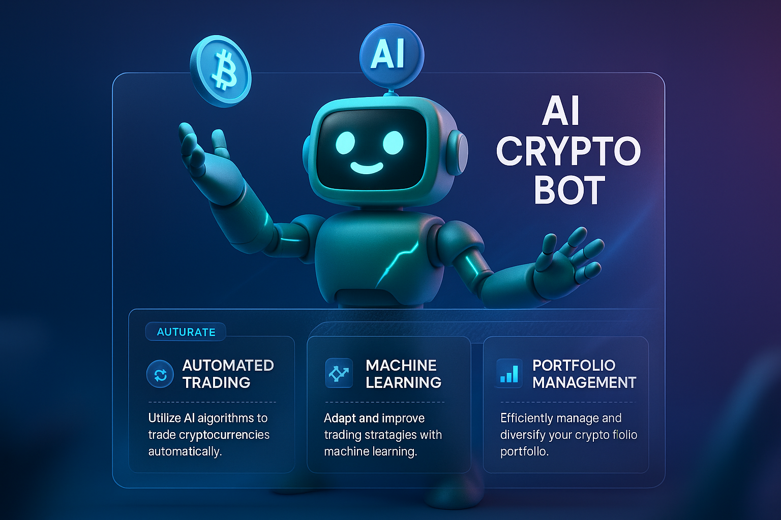 /Collection: /by davooda/Type: PNG/A 3D illustration of a friendly robot representing an AI crypto bot. It features sections for automated trading, machine learning, and portfolio management, all integrated into a cohesive design.
