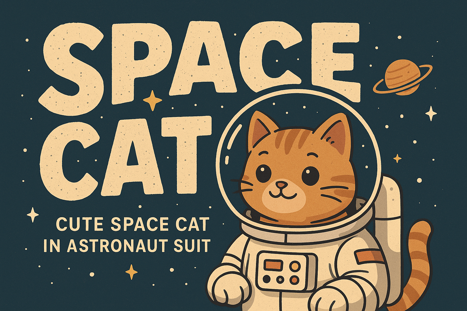 Charming graphic featuring a cute cat dressed as an astronaut against a starry background, ideal for children's products or space-themed merchandise.