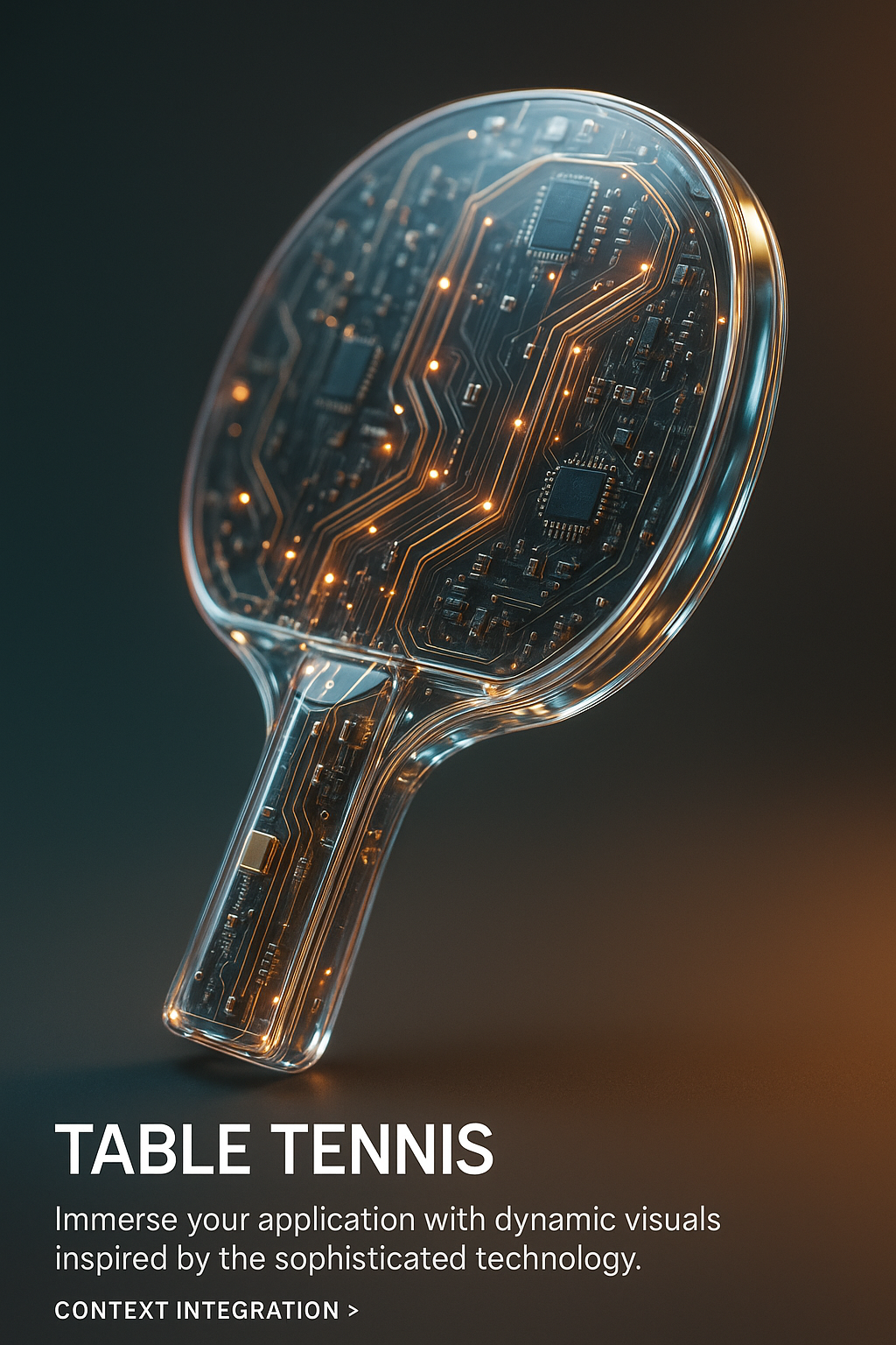/Collection: /by davooda/Type: PNG/A hyperrealistic close-up of a table tennis paddle, crafted from glass-like polymers. It features glowing micro-LEDs and intricate circuit boards, set against a softly lit gradient background.