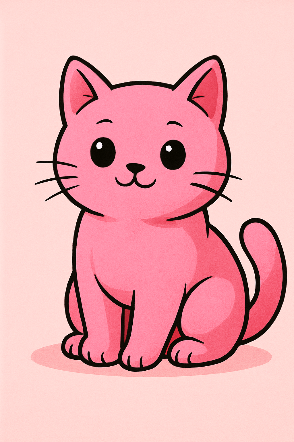 A charming illustration of a pink cartoon cat, featuring bold outlines and a playful expression, ideal for children's products or playful branding.