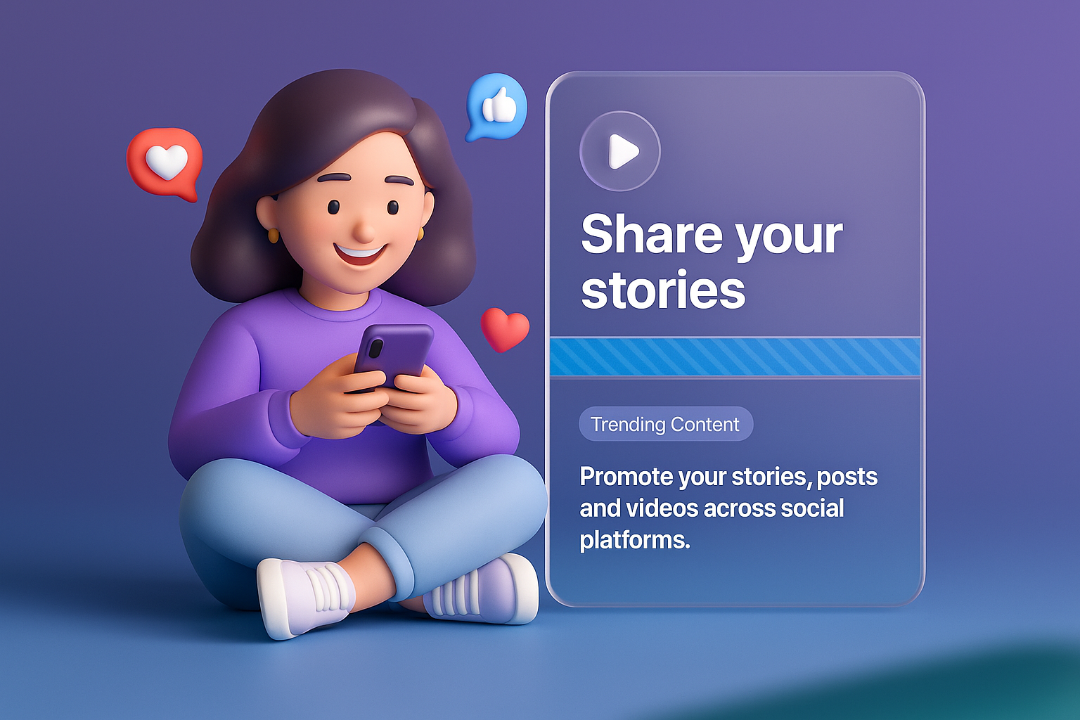 /Collection: /by davooda/Type: PNG/A cheerful girl using her phone to engage with social media, surrounded by heart and thumbs-up icons. The image features a modern design with a transparent content block for advertisements.