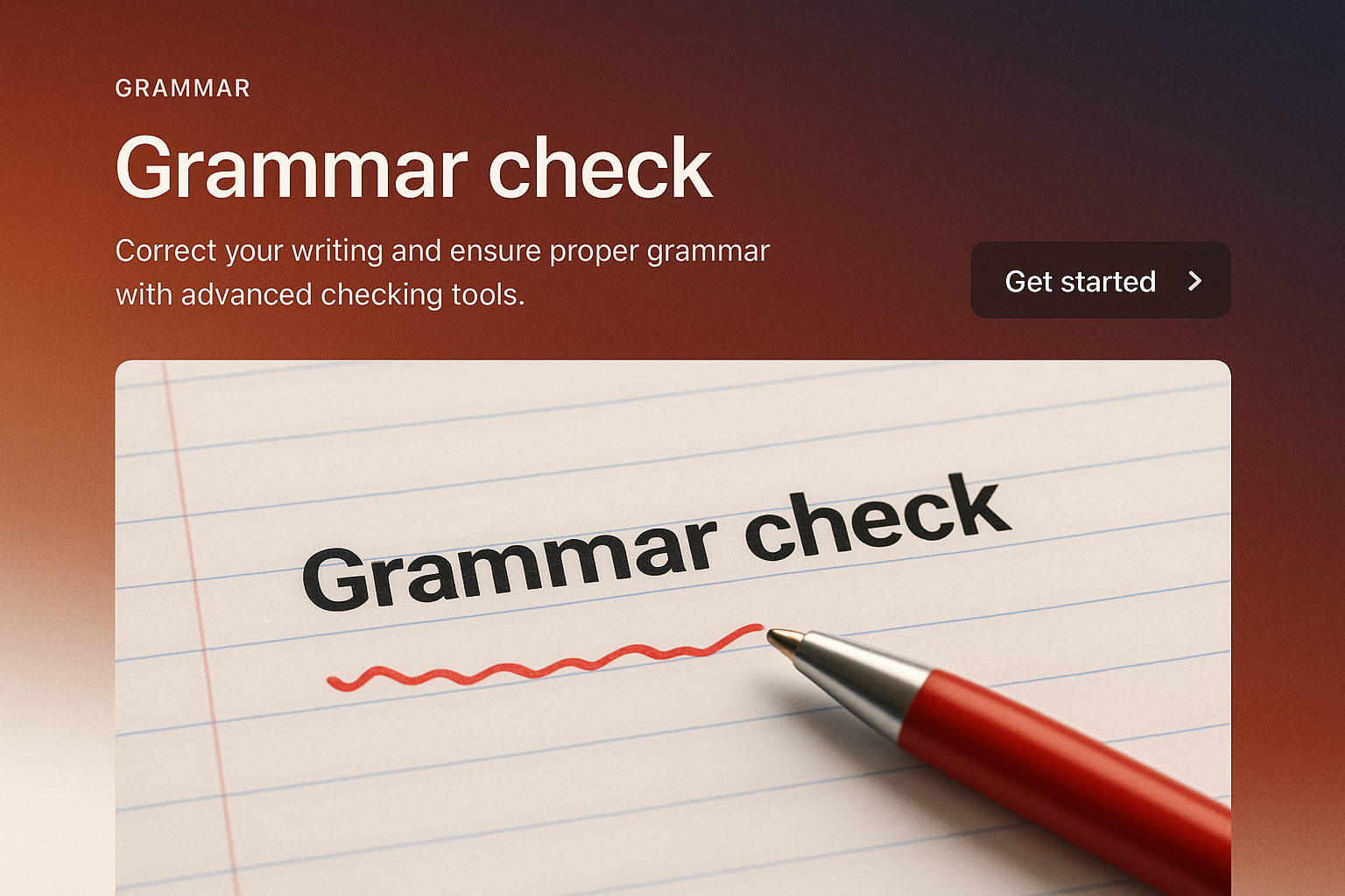 A modern web page featuring a 'Grammar Check' tool. The design includes a gradient background, a prominent title, and a call-to-action button, all in a cohesive layout.