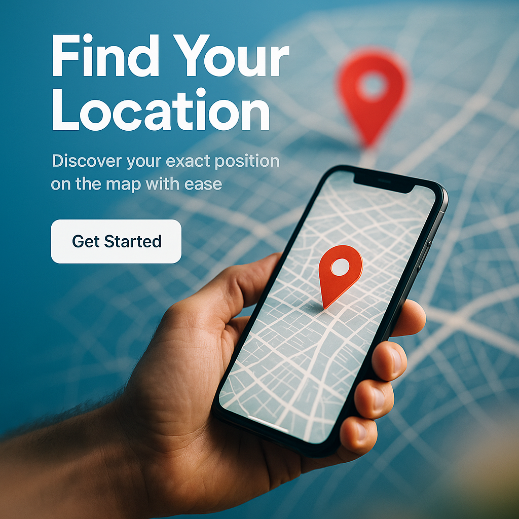 This image showcases a mobile phone displaying a map with a location pin, emphasizing ease of finding one's position. It is ideal for a promotional banner or advertisement for a location-based app.