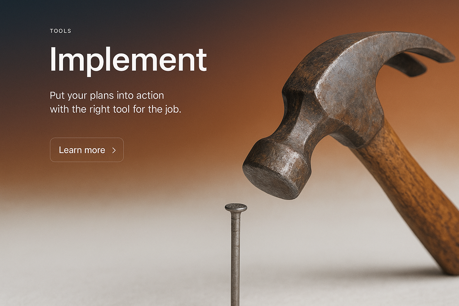 A modern web design mockup featuring a hammer and nail on a gradient background. The layout includes a prominent title and a call-to-action button, emphasizing a realistic style.