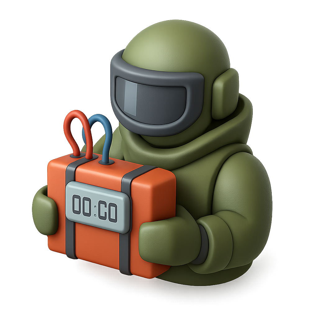 A 3D illustration of an adorable bomb disposal character holding a dynamite stick. The figure features a helmet and protective gear, set against a dark background.