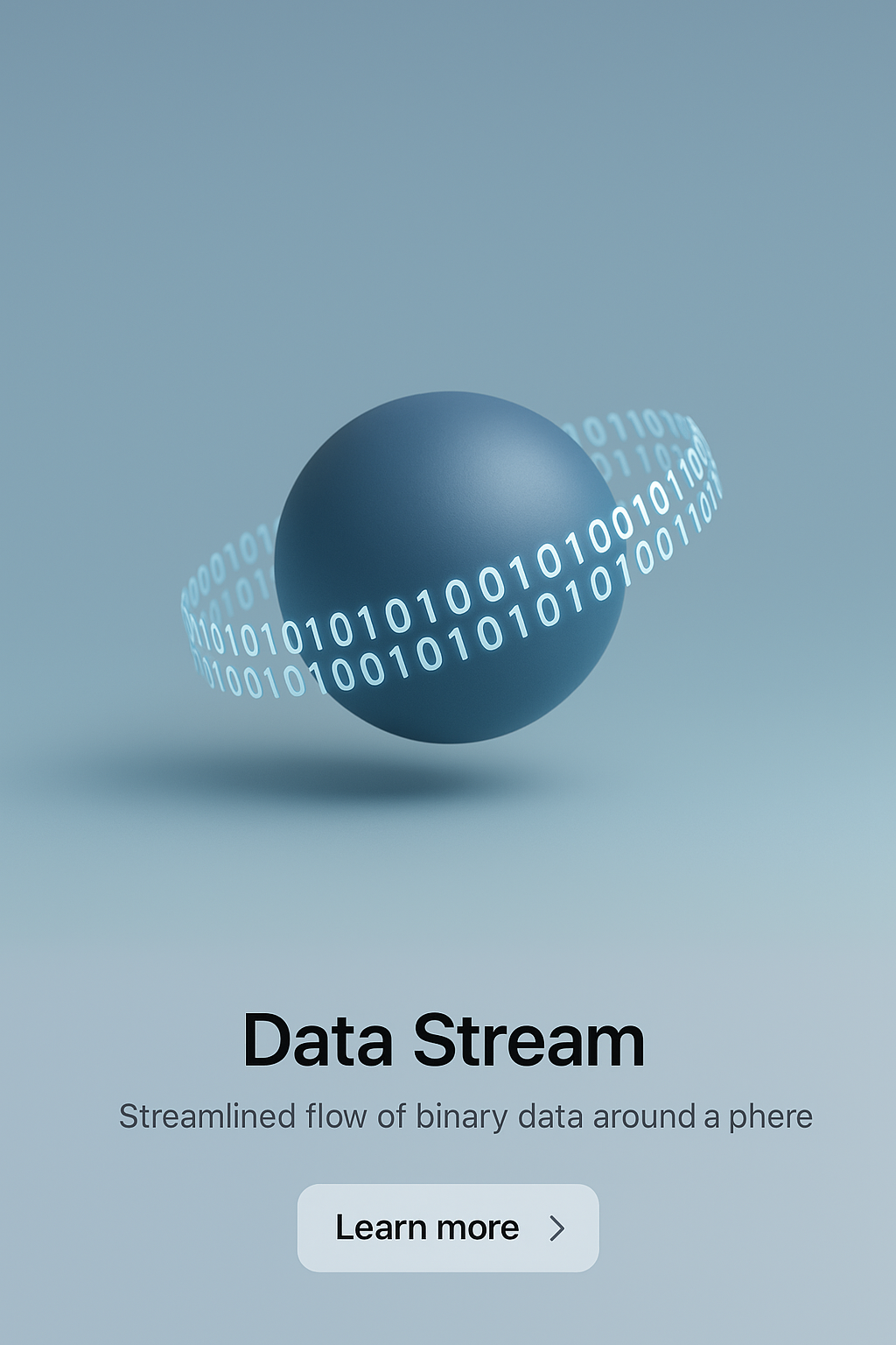 A visually striking 3D scene featuring a sphere surrounded by flowing binary data. The background has a smooth gradient, enhancing the futuristic theme.