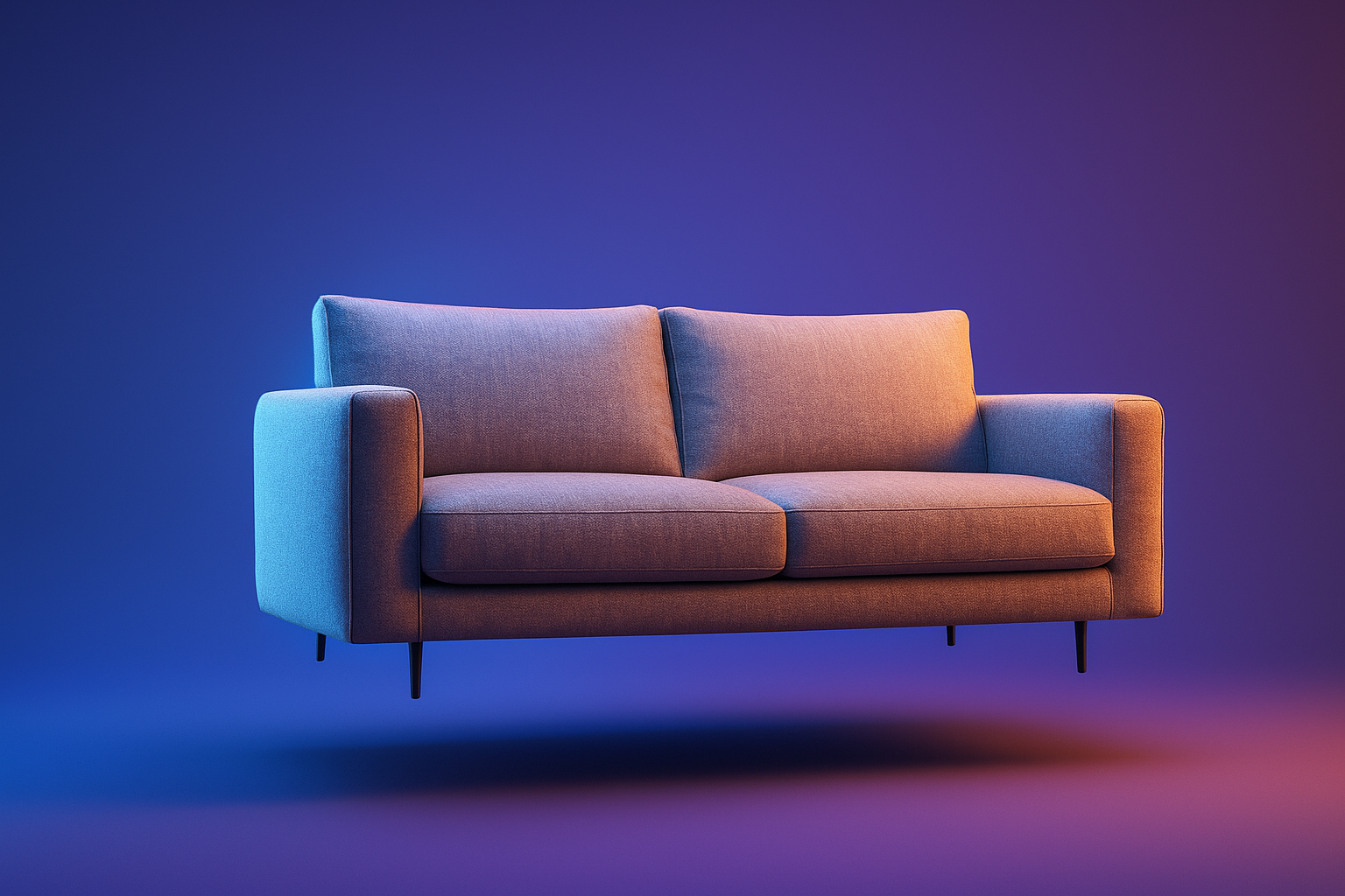 A modern living room featuring a sleek, floating sofa illuminated by contrasting lights from both sides, set against a vibrant solid color background, creating a clean and engaging aesthetic.