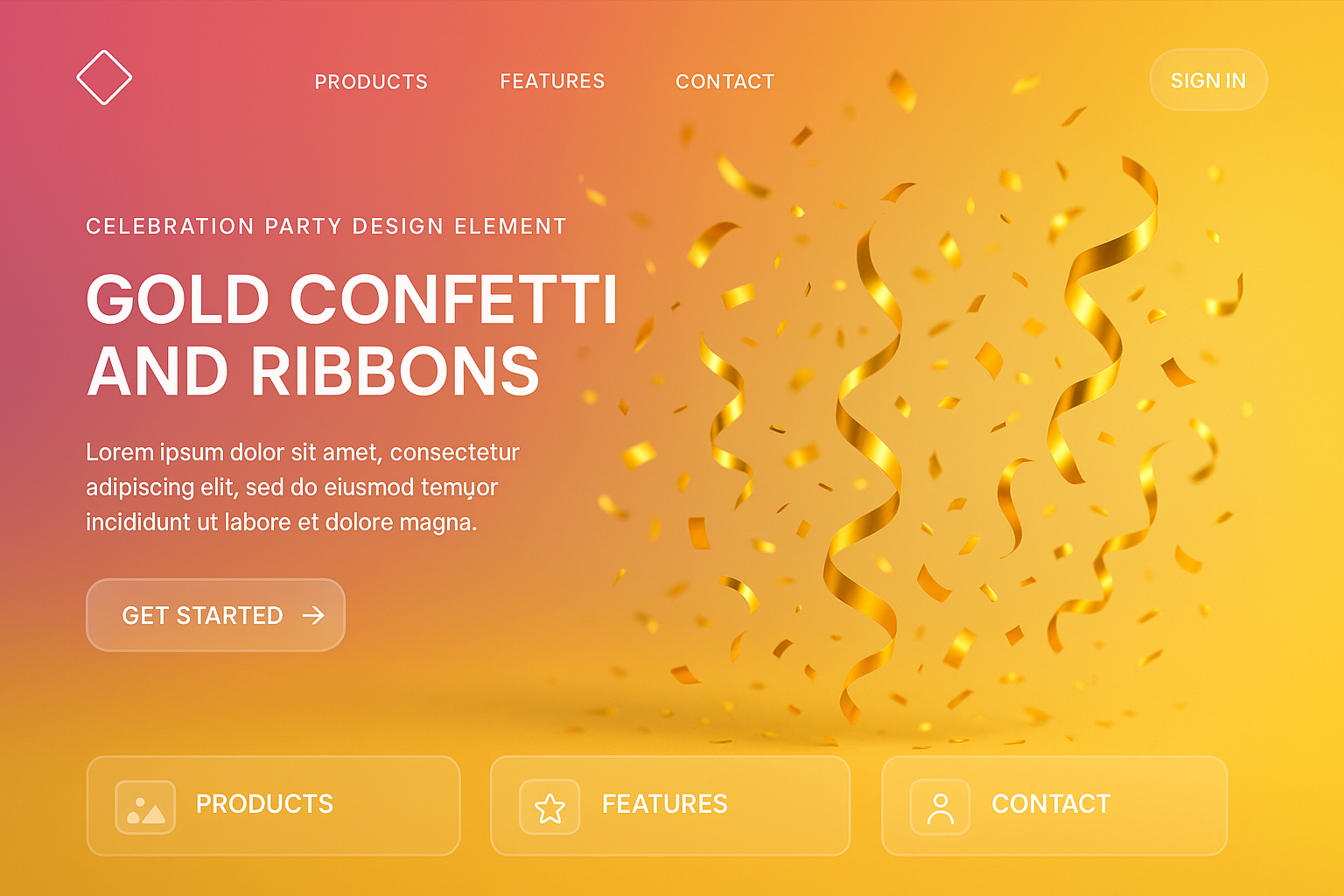 /Collection: /by davooda/Type: PNG/A vibrant design element featuring falling gold confetti and ribbons on a bright gradient background. The layout includes glassmorphism panels, a bold headline, and a call-to-action button.