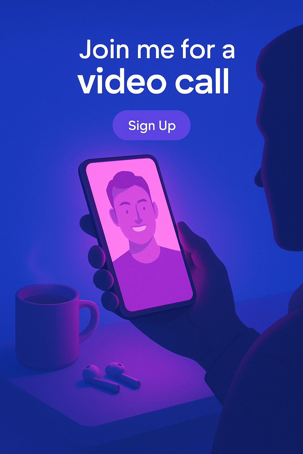 /Collection: /by davooda/Type: PNG/A person holding a smartphone displaying a video call, illuminated by a vibrant neon-pink glow. The background is a solid blue, enhancing the glowing effect. Nearby, a coffee cup and earphones add to the cozy atmosphere.