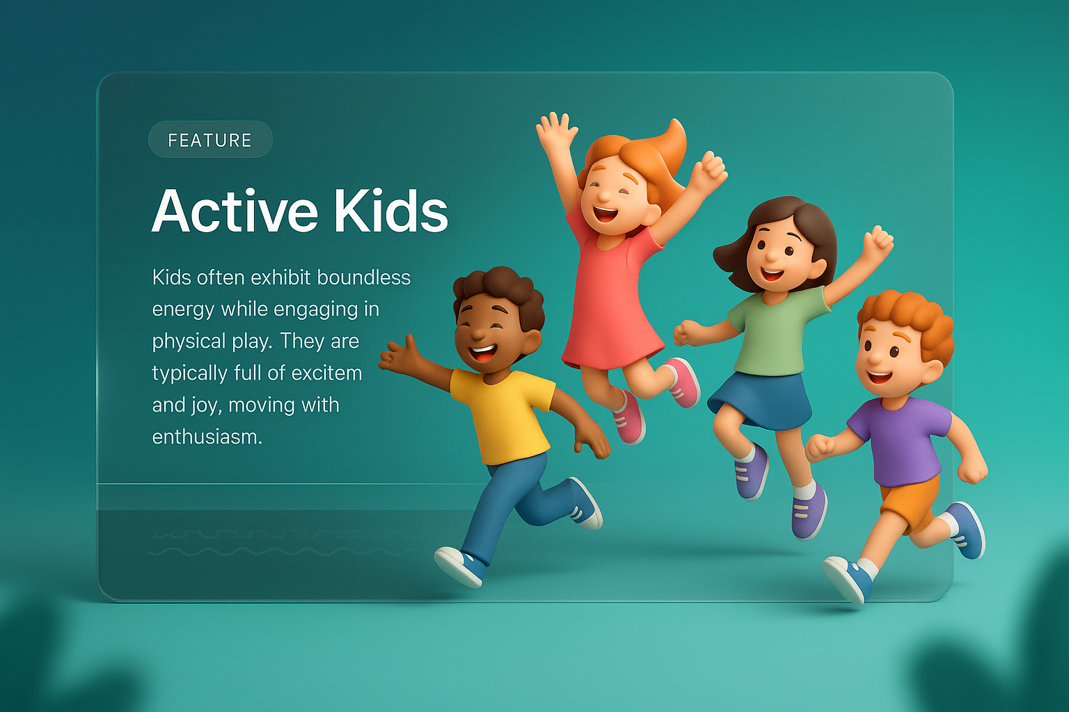 A vibrant 3D illustration featuring happy children jumping and playing energetically. The scene captures the joy and excitement of kids engaged in physical play, set against a smooth gradient background.