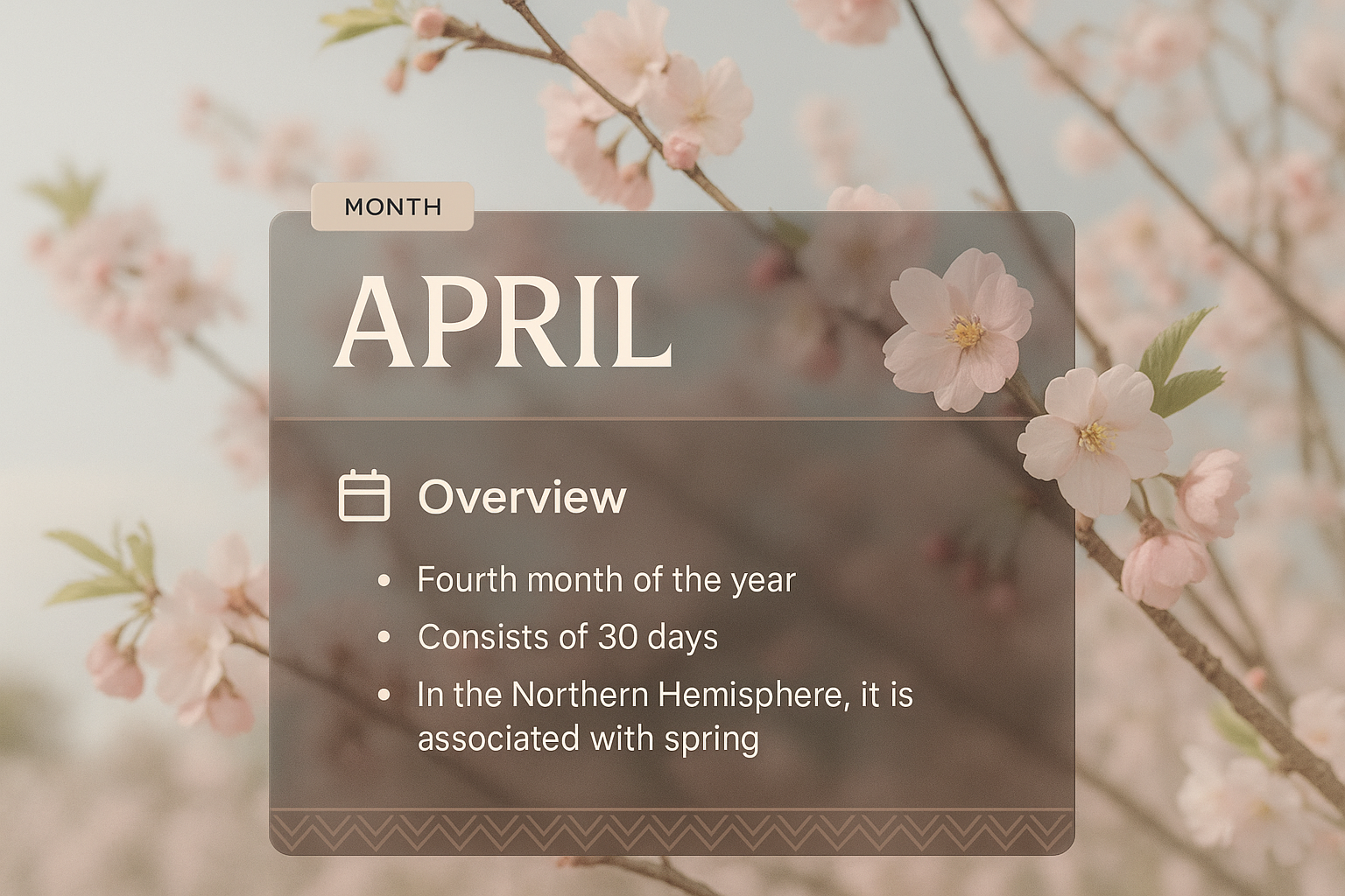 A visually appealing web page design highlighting April with a soft gradient background and floral accents. The layout includes an overview box with a title, icon, and key points.