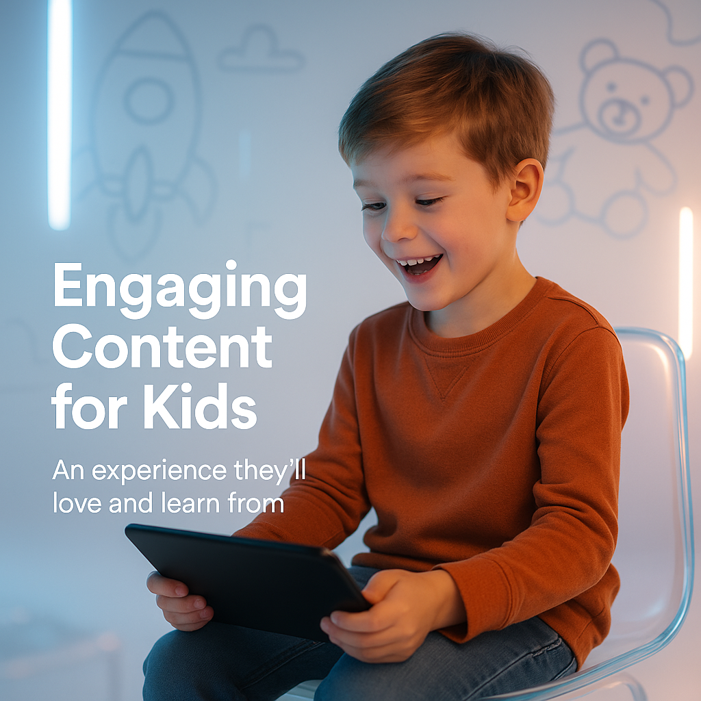 /Collection: /by davooda/Type: PNG/Bright and cheerful image showcasing a young boy interacting with a tablet, highlighting engaging educational content designed for children. Ideal for marketing digital learning platforms.