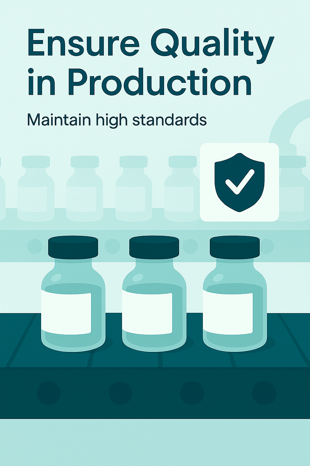/Collection: /by davooda/Type: PNG/Infographic illustrating the importance of quality control in production, featuring bottles on a conveyor belt with a modern design suitable for pharmaceutical or manufacturing contexts.