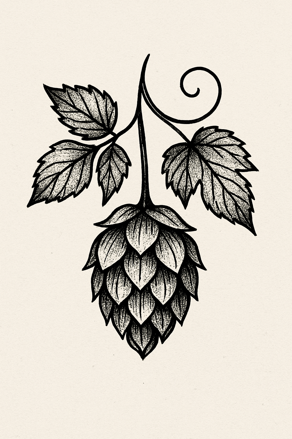 This is a detailed black and white illustration of a hop cone and leaves, showcasing intricate line work. Suitable for botanical art, brewing themes, and design projects.
