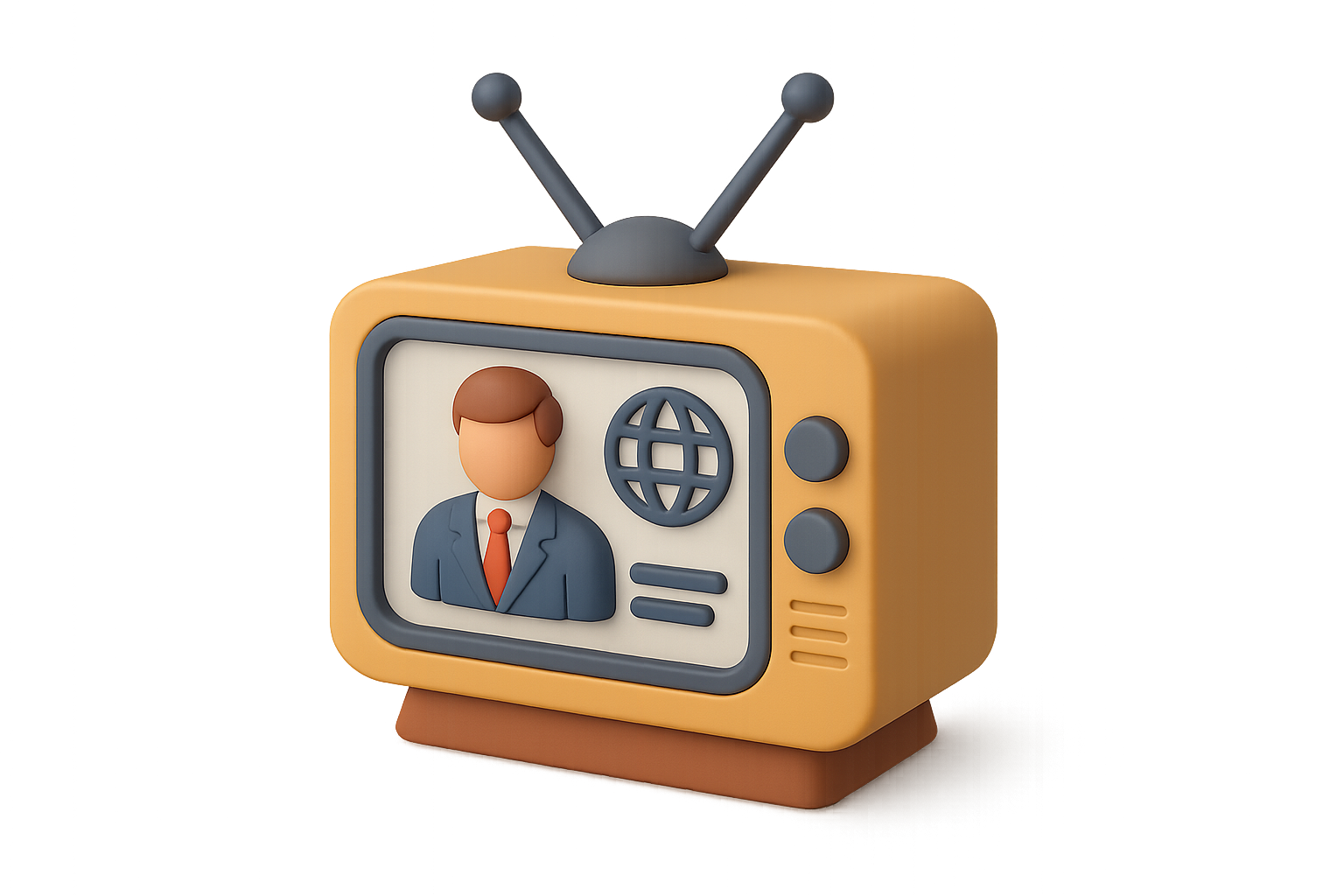 A stylized 3D icon depicting a retro television set featuring a human figure in a suit and a globe. The design showcases a vibrant color palette with a volumetric feel.