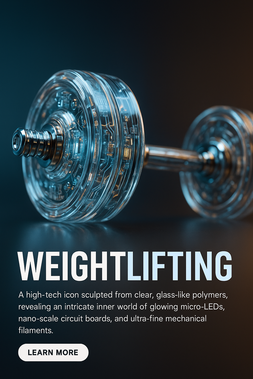 /Collection: /by davooda/Type: PNG/A hyperrealistic close-up of a weightlifting icon made from glass-like polymers, showcasing intricate internal LEDs and metallic components. The design emphasizes precision and high-tech aesthetics.