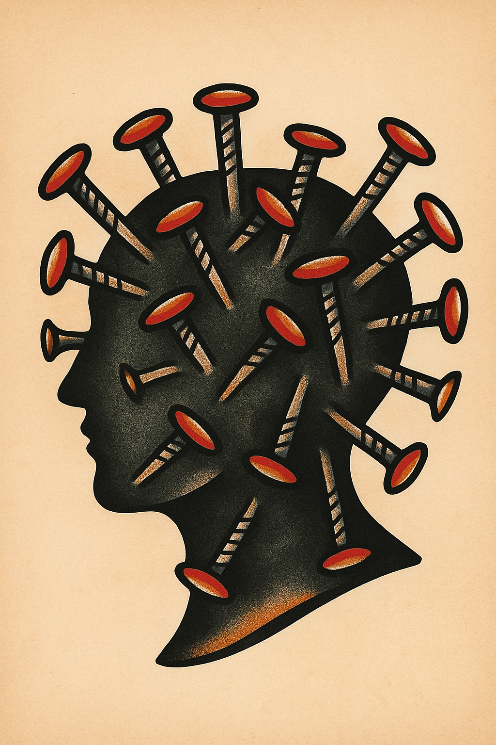 A striking silhouette of a head filled with protruding nails, illustrated in a classic tattoo style with vibrant colors on a beige background.