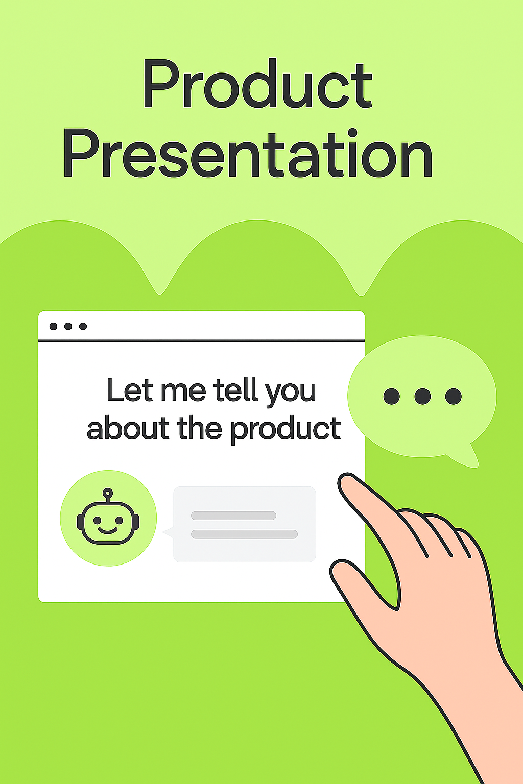 Modern graphic for product presentation featuring a hand interacting with a chatbot interface, ideal for tech marketing and presentations.