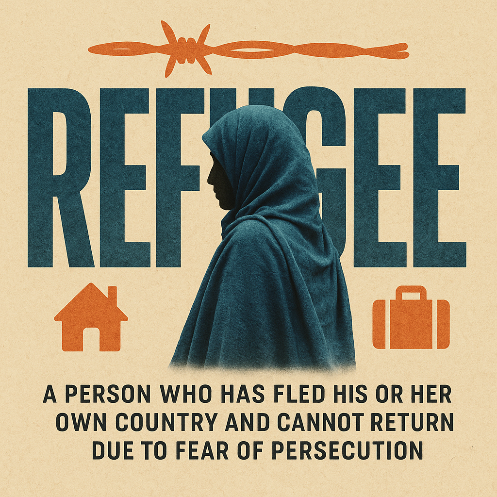 /Collection: /by davooda/Type: PNG/Informative social media graphic illustrating the concept of refugees, featuring bold typography and simple iconography. Ideal for raising awareness about refugee issues.