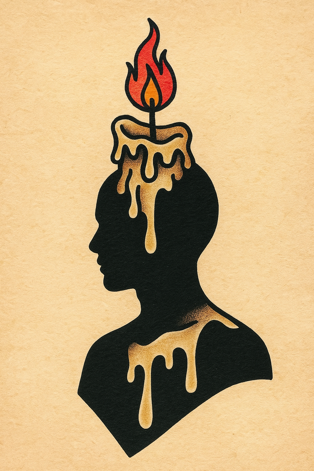 This image features a striking silhouette of a head shaped like a melting candle, complete with a flame and wax drips. The design is rendered in multiple colors against a light beige background.