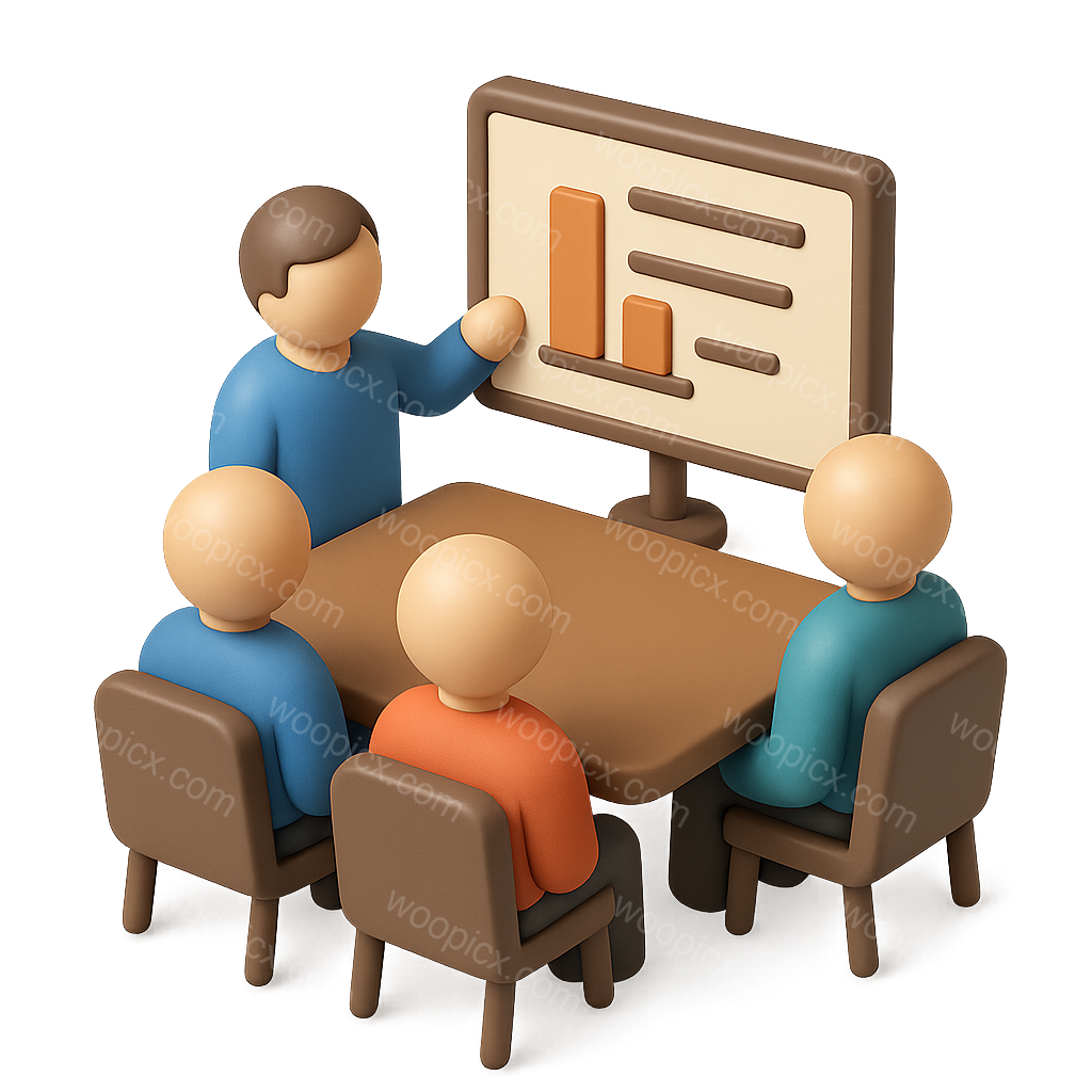 /Premium/Collection: /by davooda/Type: PNG/A 3D representation of a board meeting featuring four characters around a table, engaging with a presentation screen displaying charts. The scene has a warm, inviting color palette.