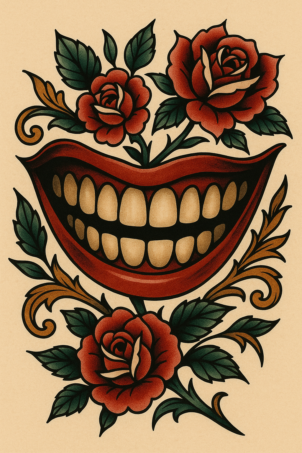 Bold Tattoo Art Featuring a Grinning Mouth and Roses