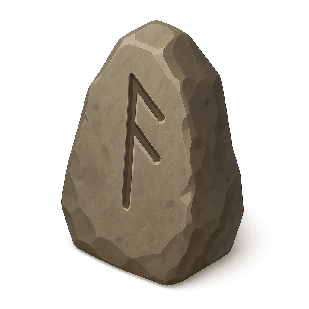 A stylized 3D icon of a Viking rune stone, depicted in a three-quarter view. The stone features a prominent rune carved into its surface, showcasing a textured, rocky appearance.