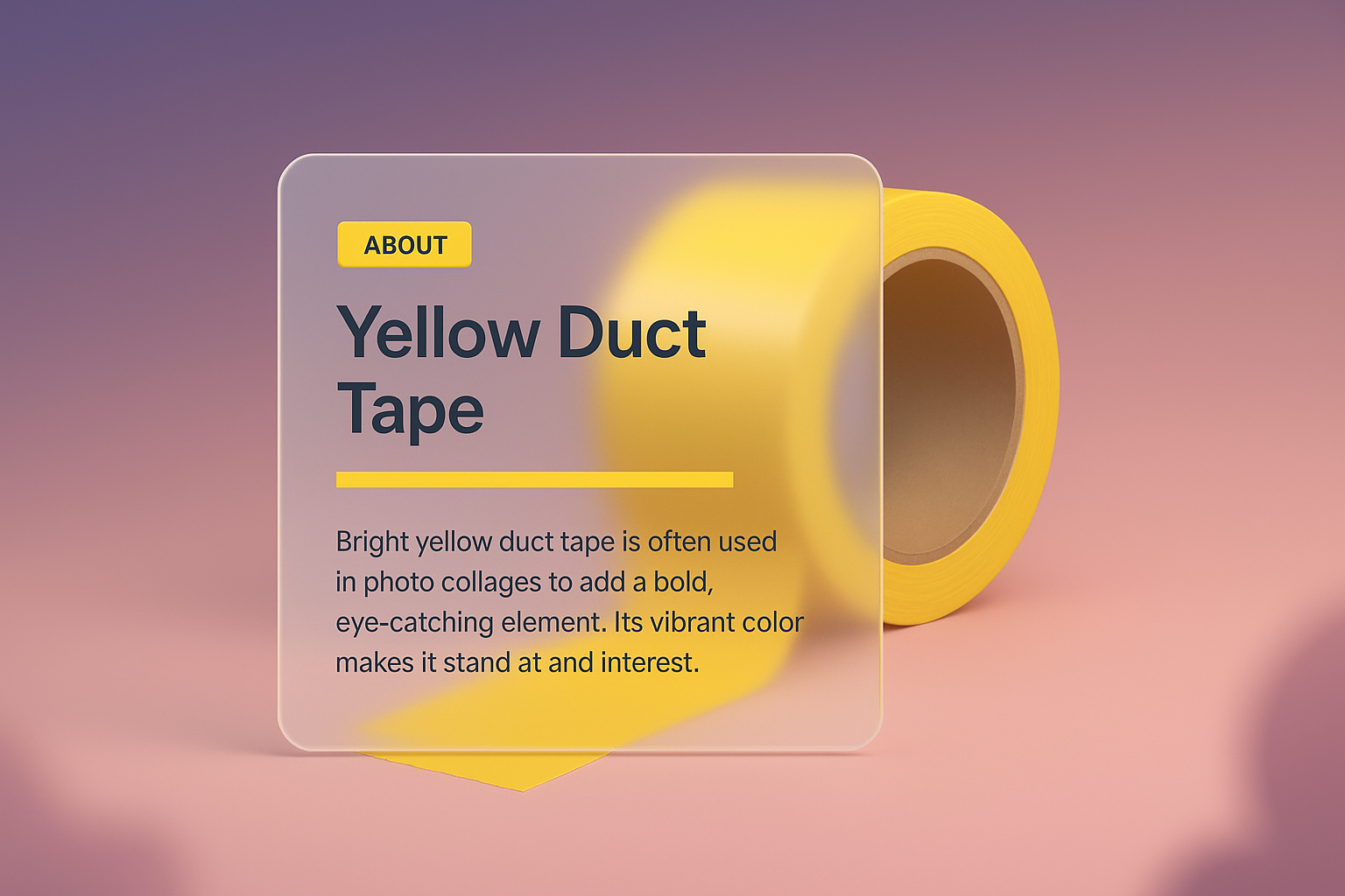 /Collection: /by davooda/Type: PNG/A visually striking image featuring a roll of bright yellow duct tape set against a smooth gradient background. The design incorporates a transparent text block with information about the tape's uses in photo collages.
