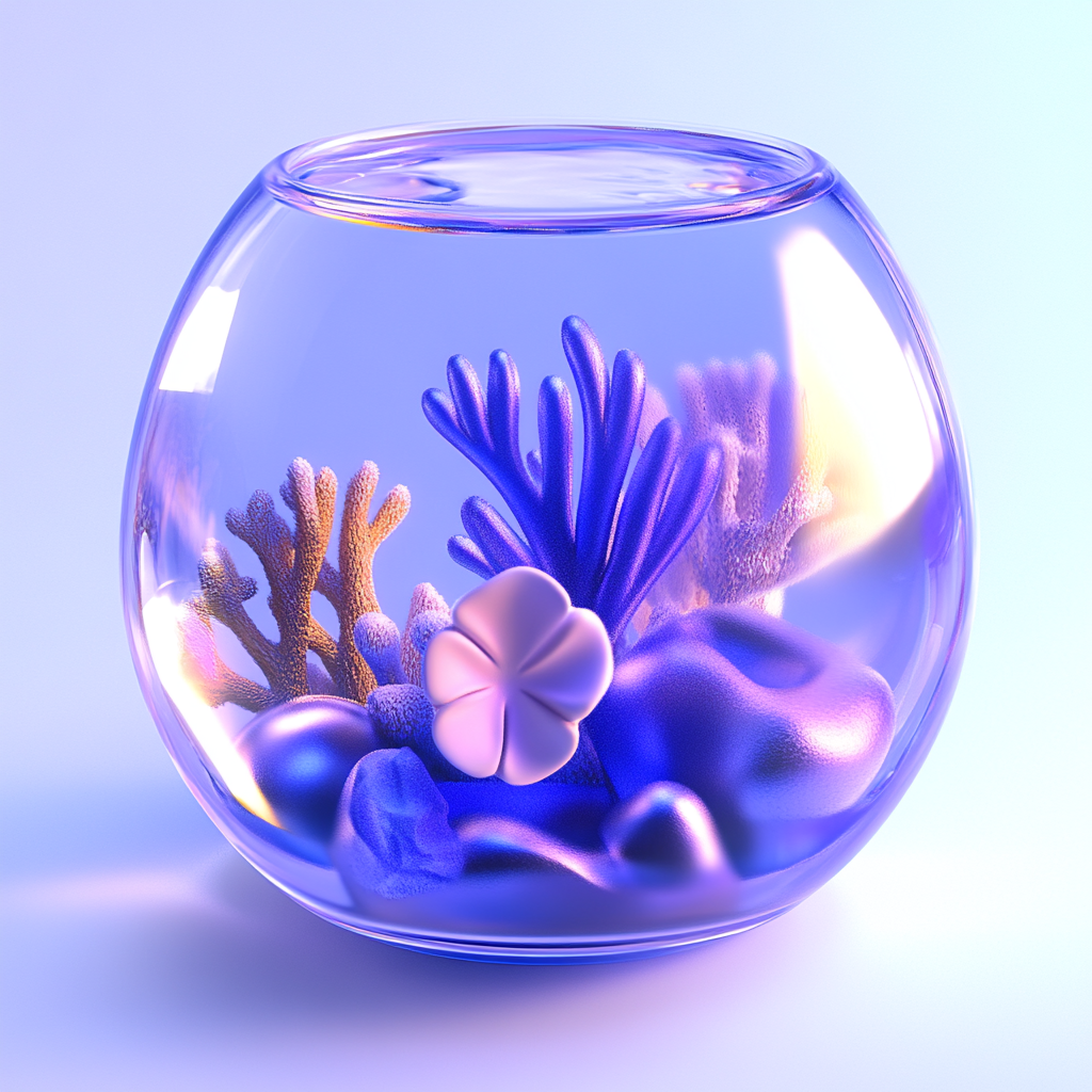 A beautifully crafted 3D rendering of a fishbowl showcasing colorful coral and decorative elements, ideal for aquarium or marine-themed projects.