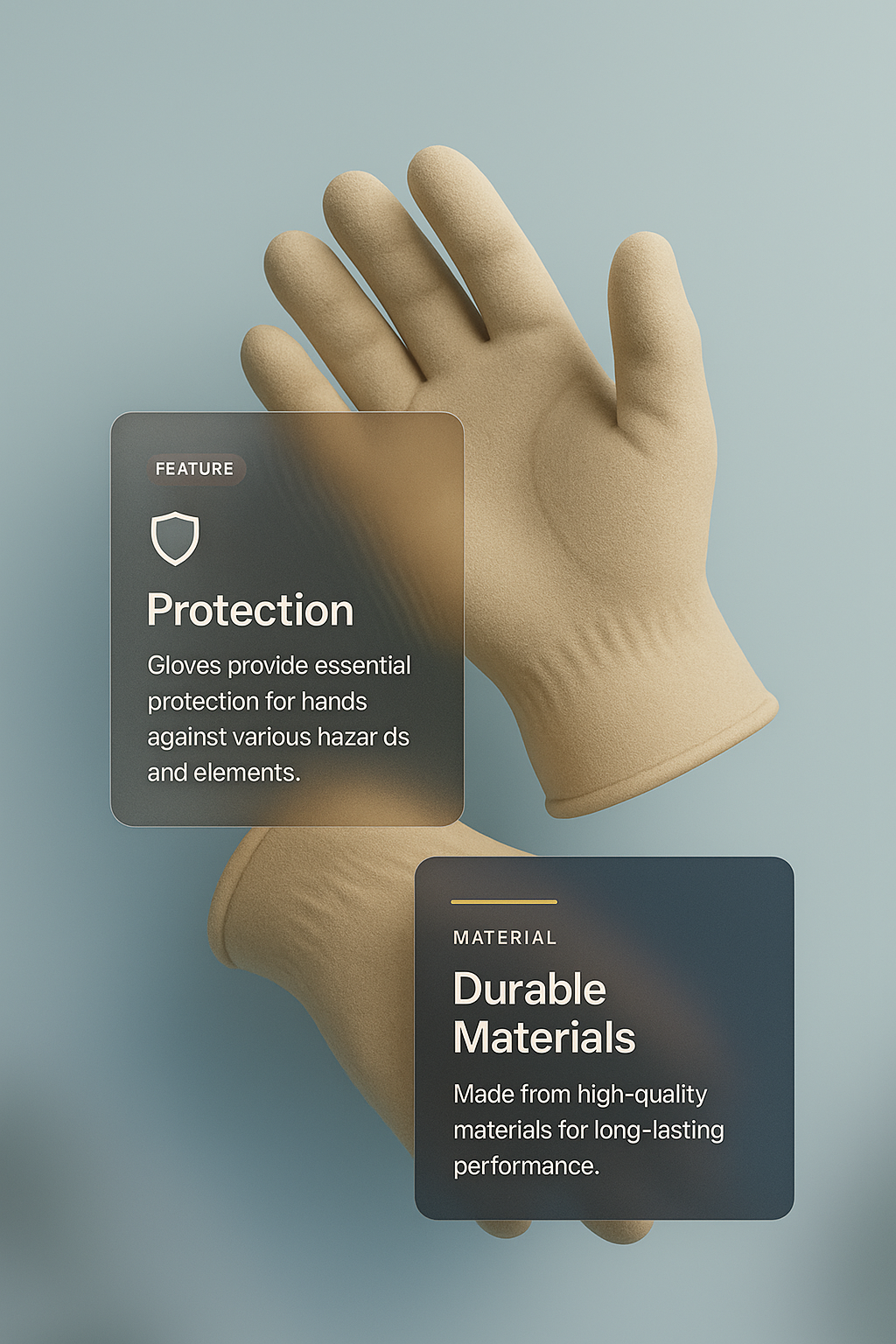 A modern web page design featuring gloves, showcasing two informative blocks with icons and text. The design uses a light tone with a subtle gradient background and incorporates a translucent glass effect.