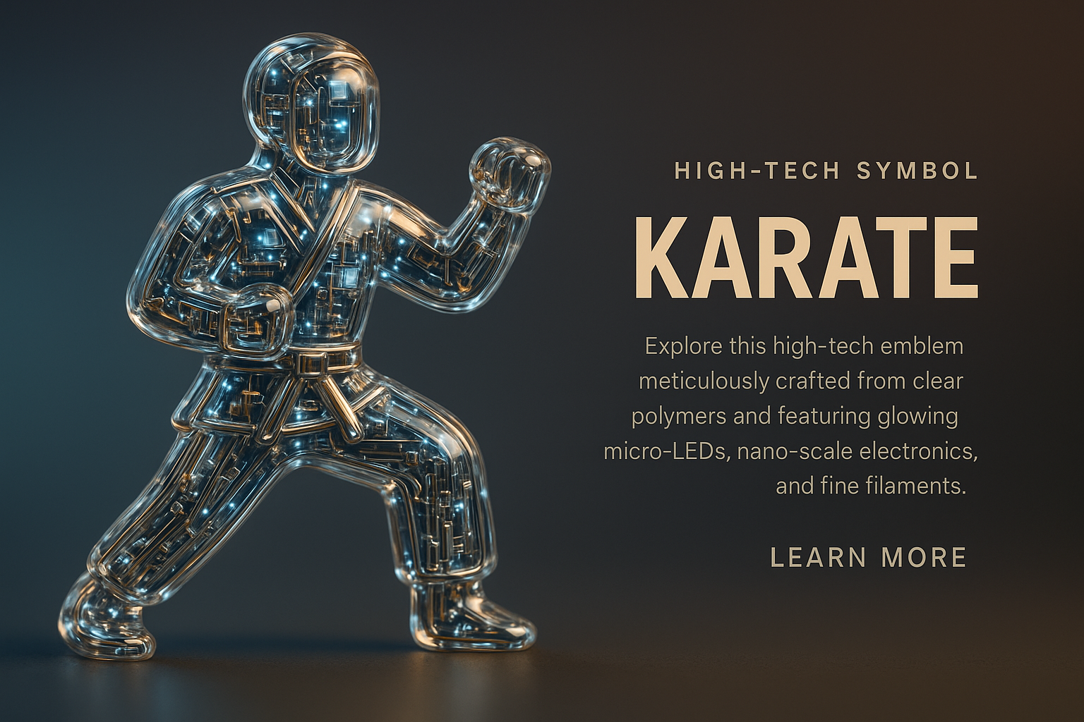 /Collection: /by davooda/Type: PNG/A hyperrealistic karate symbol made of clear, glass-like polymers showcases an intricate inner world of glowing micro-LEDs and mechanical filaments, set against a stylish gradient background.