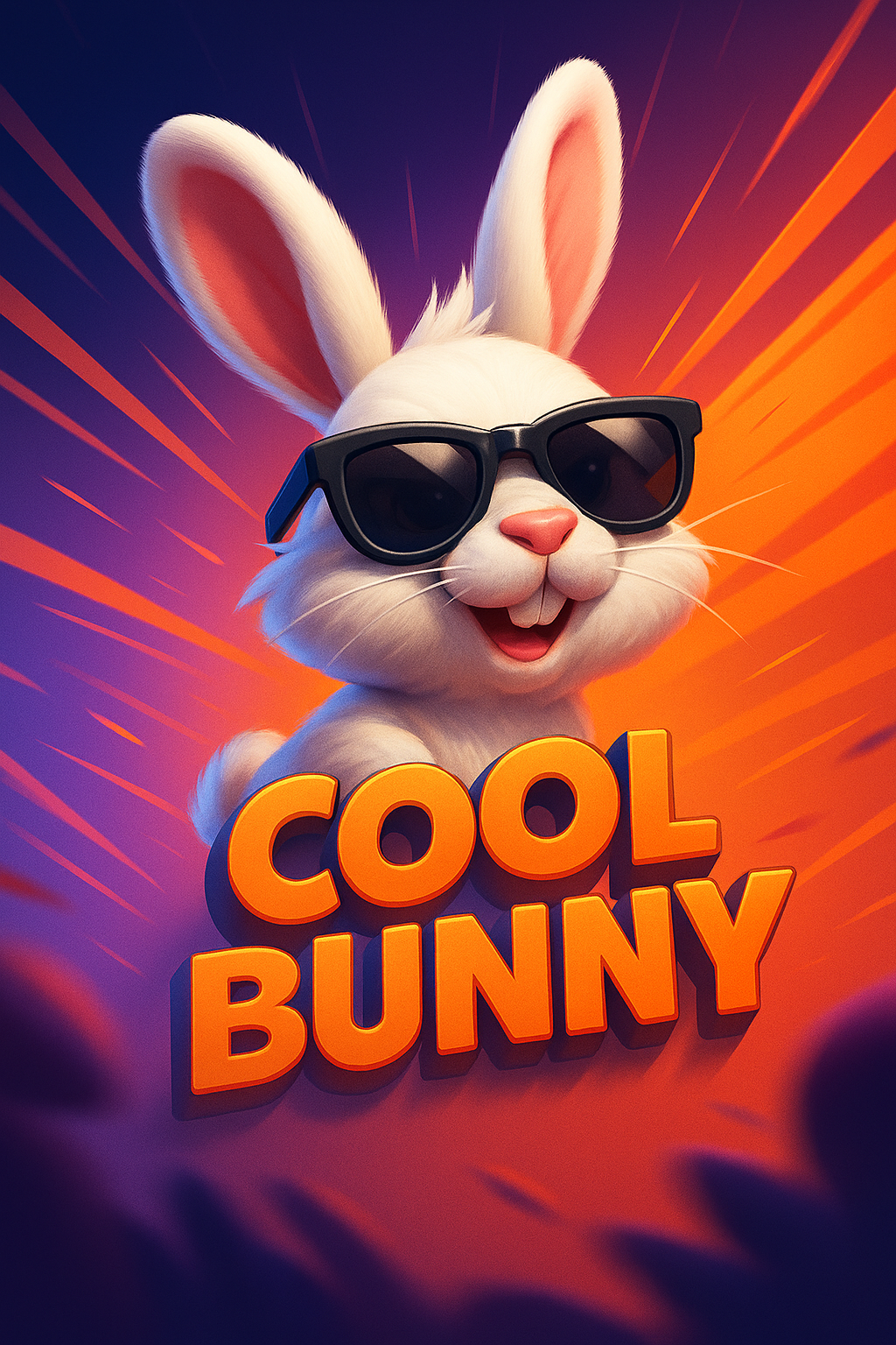 /Collection: /by davooda/Type: PNG/A lively 3D illustration of a cheerful bunny wearing sunglasses, set against a colorful gradient background with dynamic lines radiating from the center, creating an engaging composition.