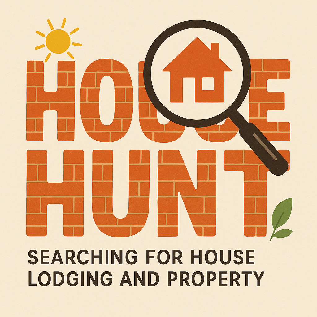 /Collection: /by davooda/Type: PNG/Vibrant promotional graphic for real estate, showcasing a house search theme with a magnifying glass and bold typography. Ideal for advertising housing services.