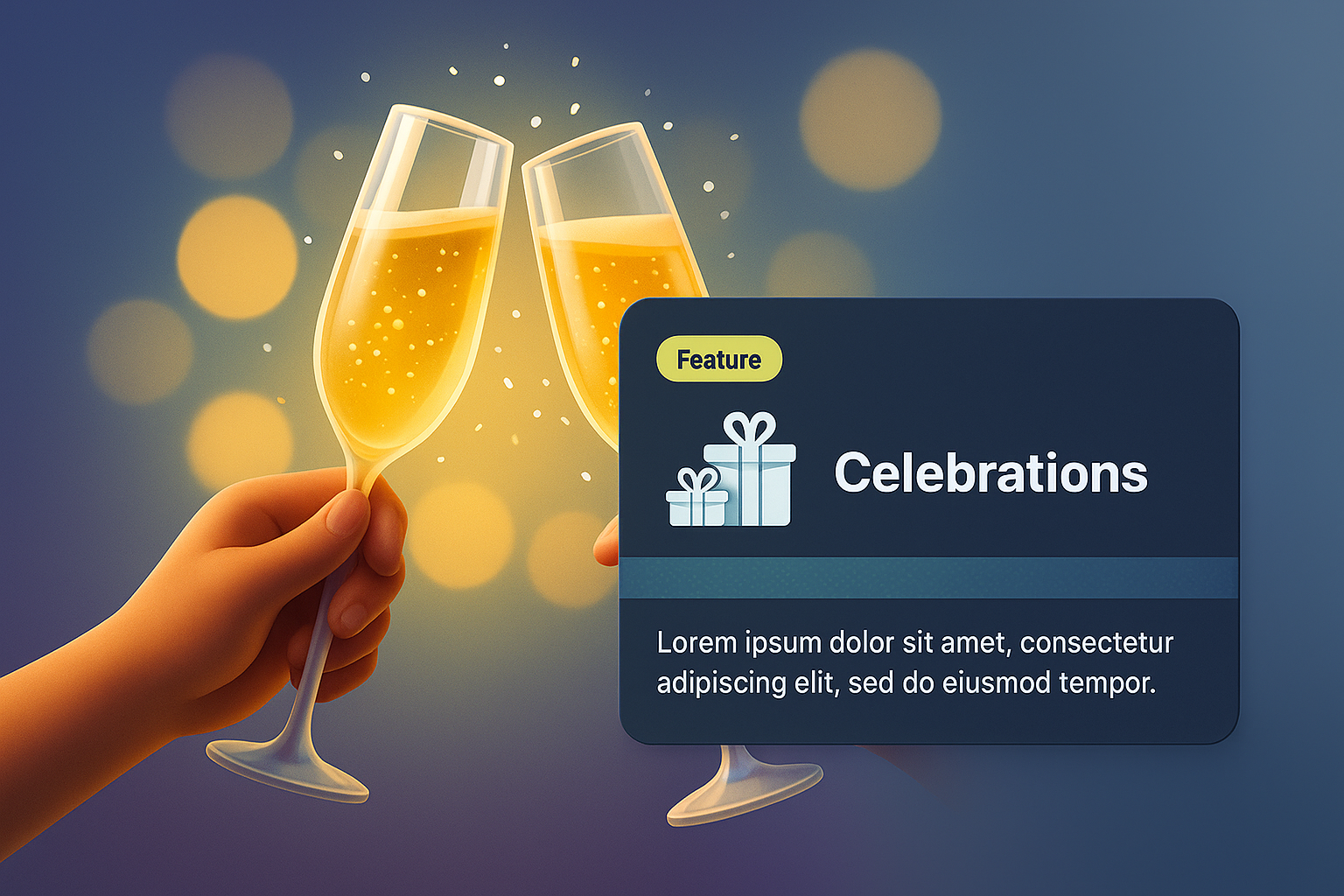 Two hands clink glasses of champagne amid blurred golden lights, symbolizing celebration. A graphic block with features enhances the festive theme.