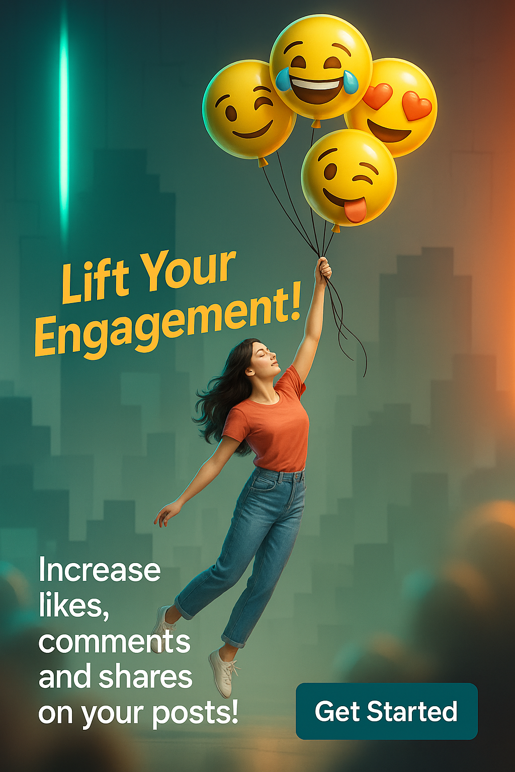 Dynamic promotional graphic featuring a young woman holding emoji balloons, aimed at encouraging social media engagement. Ideal for digital marketing campaigns.